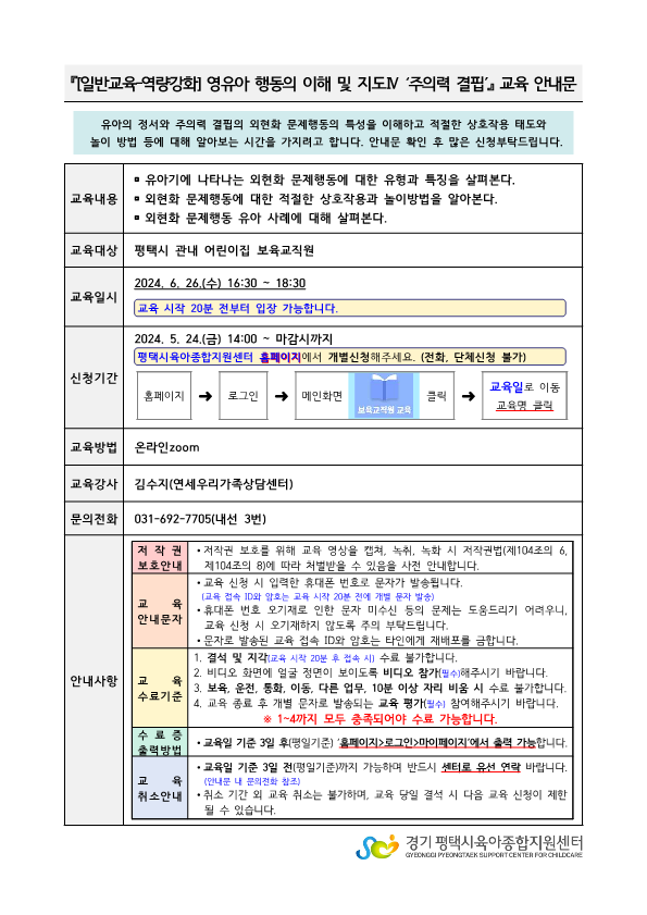 교육명 [일반교육-역량강화] 영유아 행동의 이해 및 지도Ⅳ '주의력 결핍' 교육형태 온라인 zoom