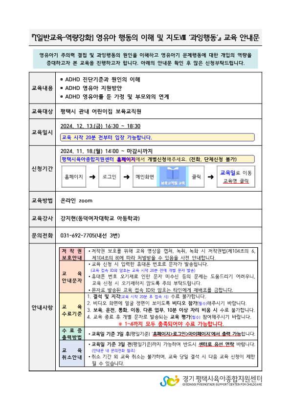교육명 [일반교육-역량강화] 영유아 행동의 이해 및 지도Ⅷ '과잉행동' 교육형태 온라인 zoom