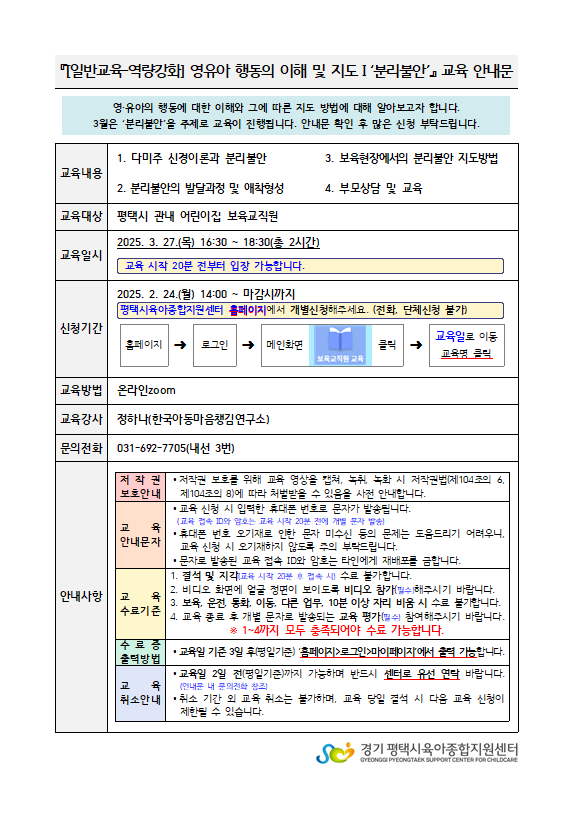 교육명 [일반교육-역량강화] 영유아 행동의 이해 및 지도Ⅰ'분리불안' 교육형태 온라인 zoom
