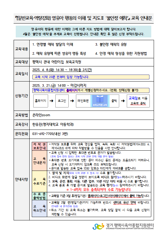 교육명 [일반교육-역량강화] 영유아 행동의 이해 및 지도Ⅱ ‘불안정 애착’ 교육형태 온라인 zoom