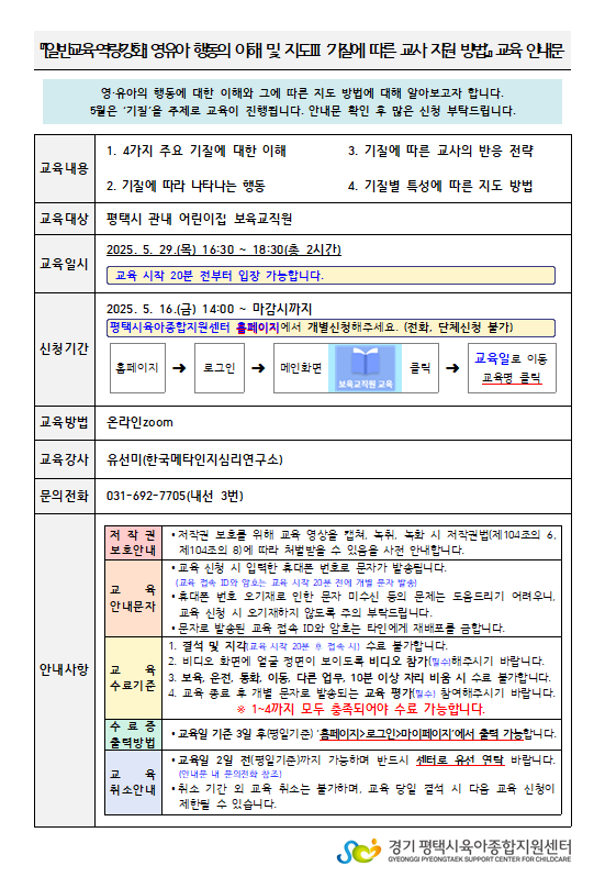 교육대상 평택시 관내 어린이집 보육교직원 강사명 유선미(한국메타인지심리연구소)