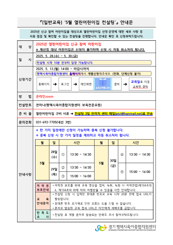교육명 [일반교육] 5월 열린어린이집 컨설팅 ② 교육형태 온라인 zoom