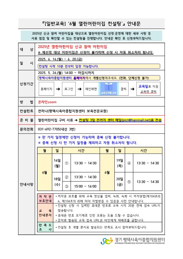 교육명 [일반교육] 6월 열린어린이집 컨설팅 ③ 교육형태 온라인 zoom