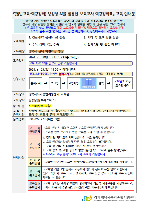 교육명 [일반교육-역량강화] 생성형 AI를 활용한 보육교사 역량강화 교육 ★원장 대상★ 교육형태 오프라인 소규모