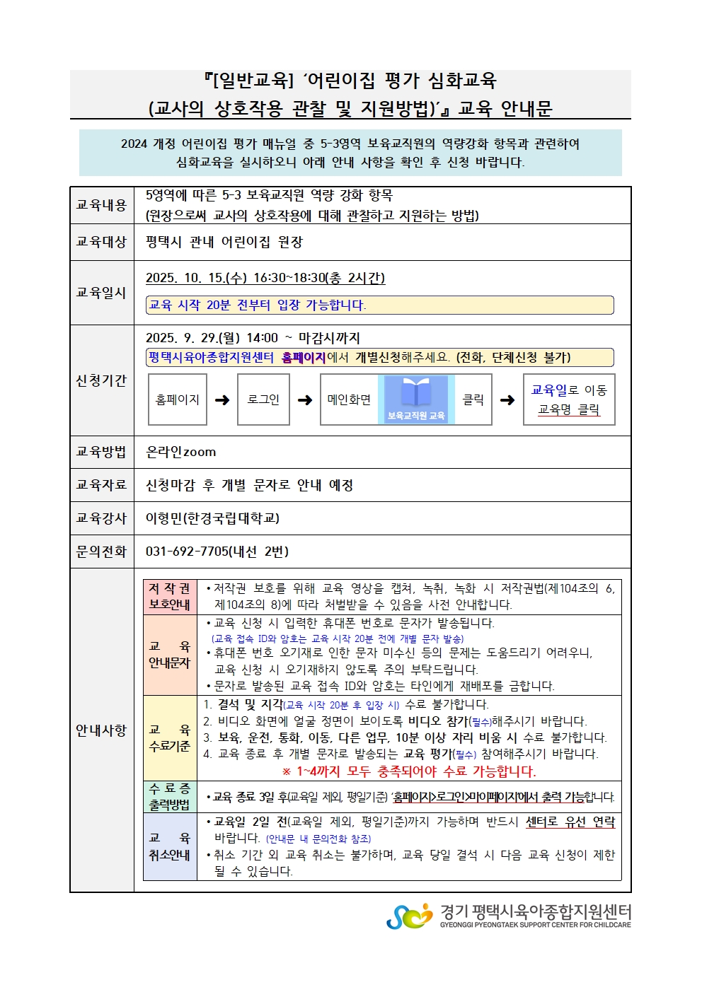 교육명 [일반] 평가제 심화교육 - 교사의 상호작용 관찰 및 지원방법(5-3) 교육형태 온라인 zoom