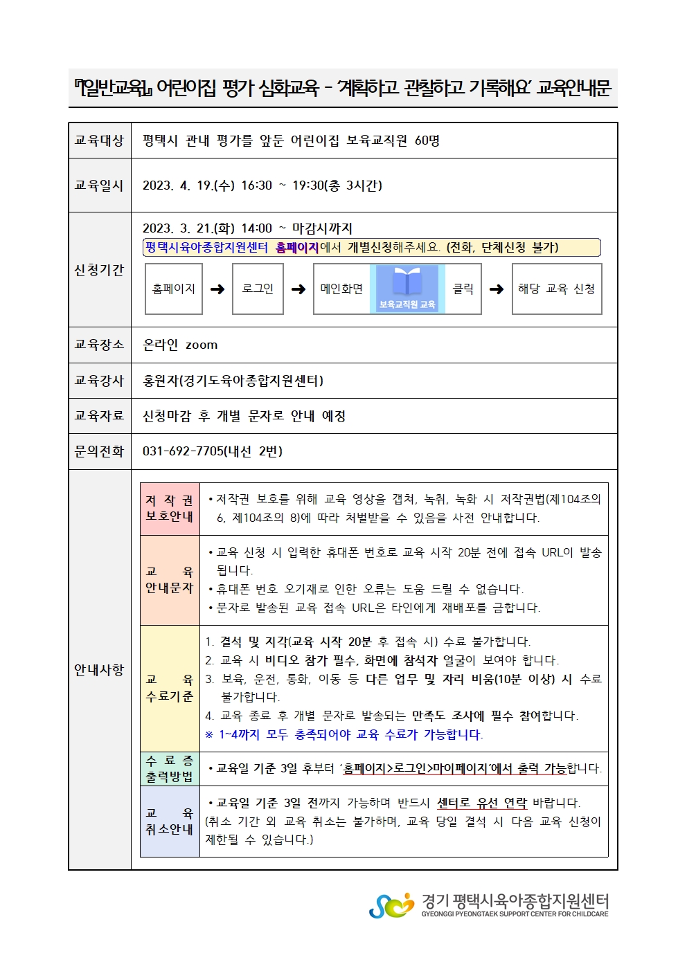 교육명 [일반교육] 어린이집 평가 지표 심화교육 - 계획하고 관찰하고 기록해요 교육형태 온라인 zoom