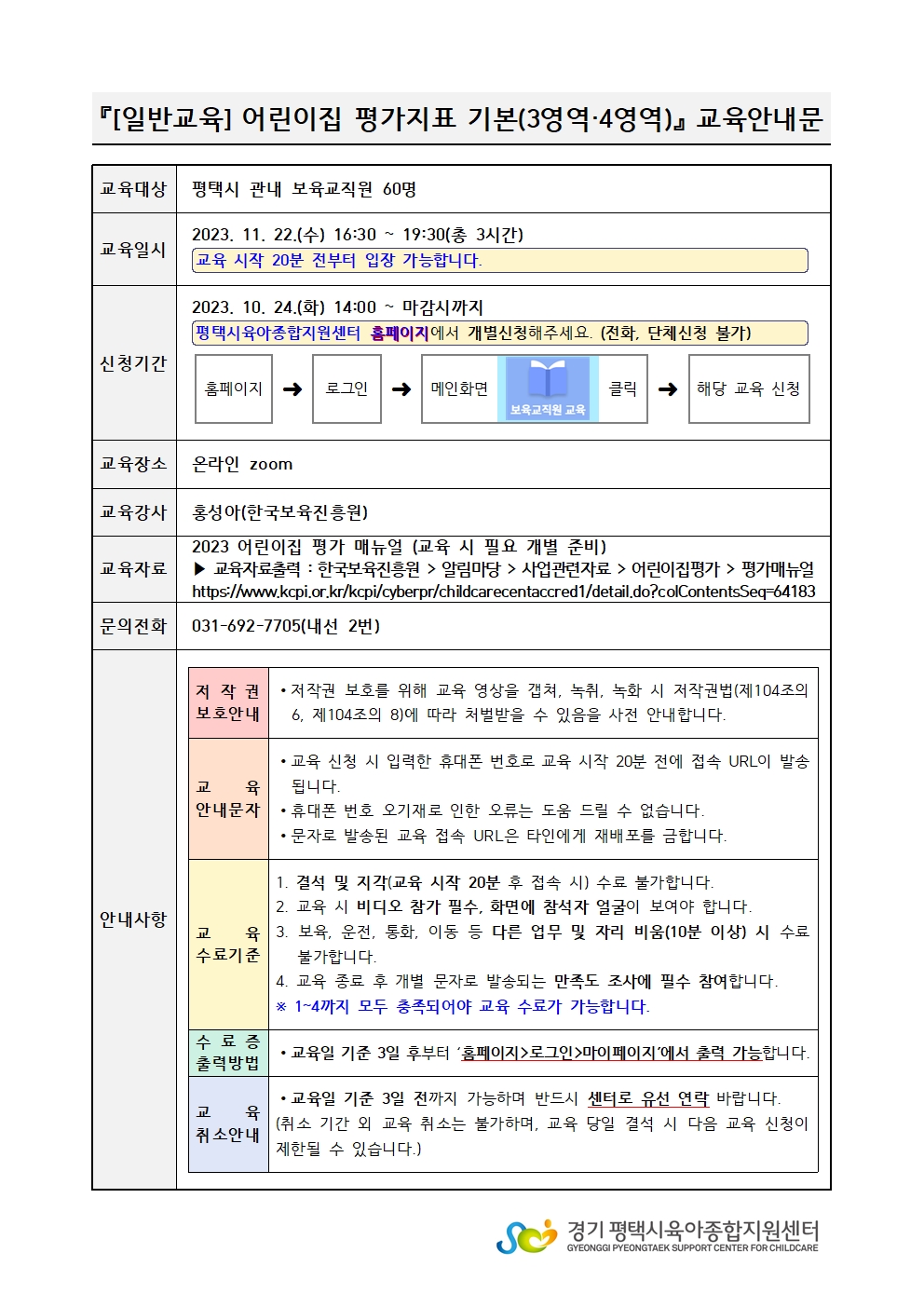 교육대상 평택시 관내 보육교직원 강사명 홍성아(한국보육진흥원)