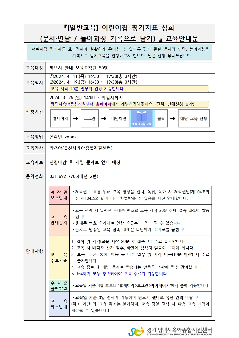 교육명 [일반교육] 어린이집 평가제 놀이과정 기록으로 담기 교육형태 온라인 zoom
