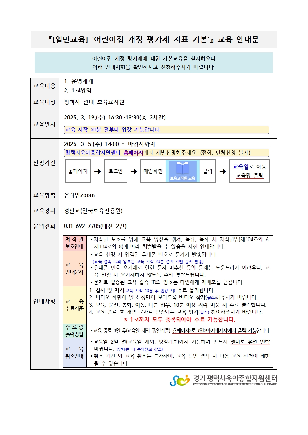 교육대상 평택시 관내 어린이집 보육교직원 강사명 정선교(한국보육진흥원)