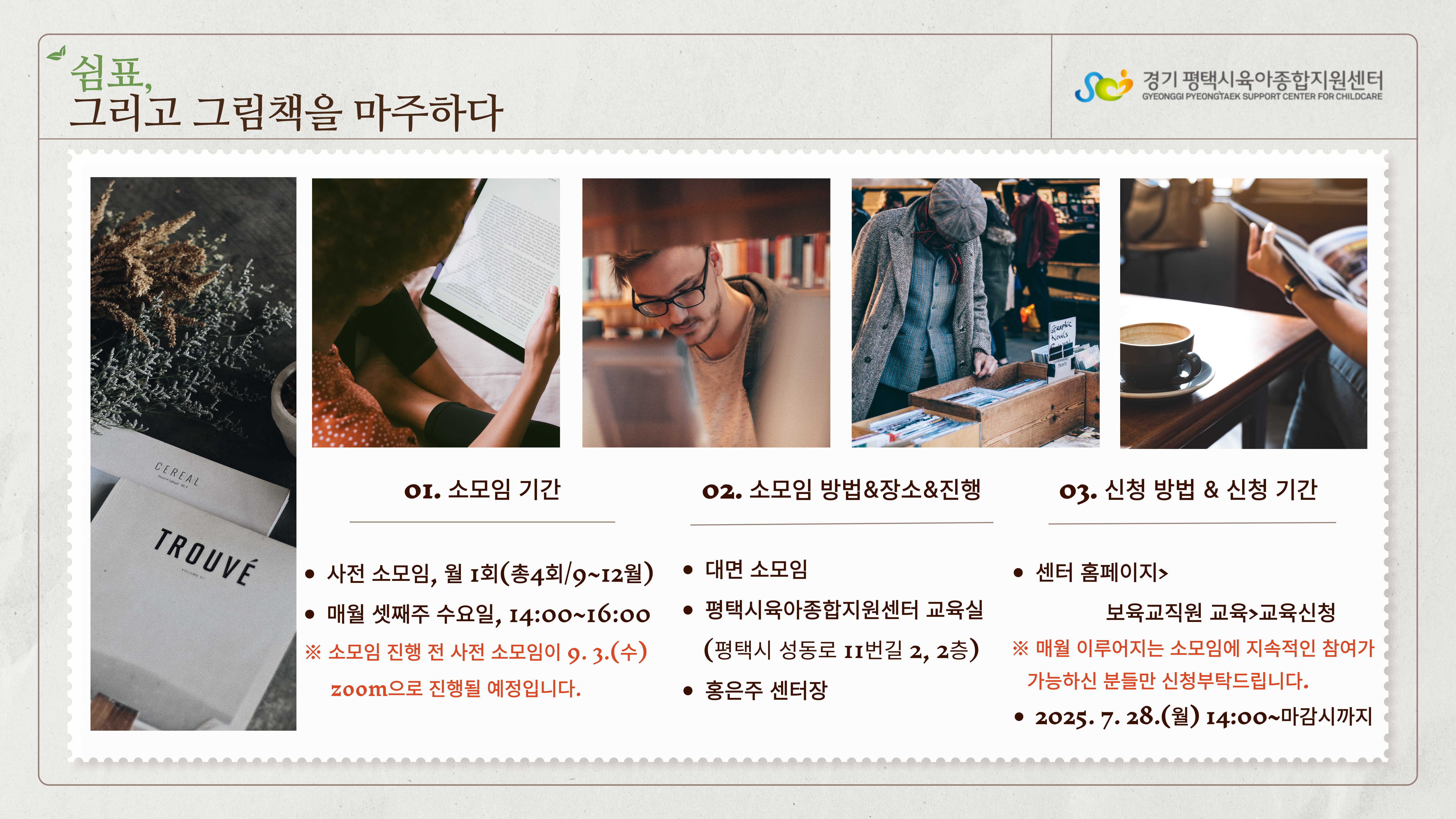 기타사항 ▶9월~12월까지 매월 1회, 소모임으로 진행됩니다. 지속적인 참여가 가능하신 분들만 신청부탁드립니다.
