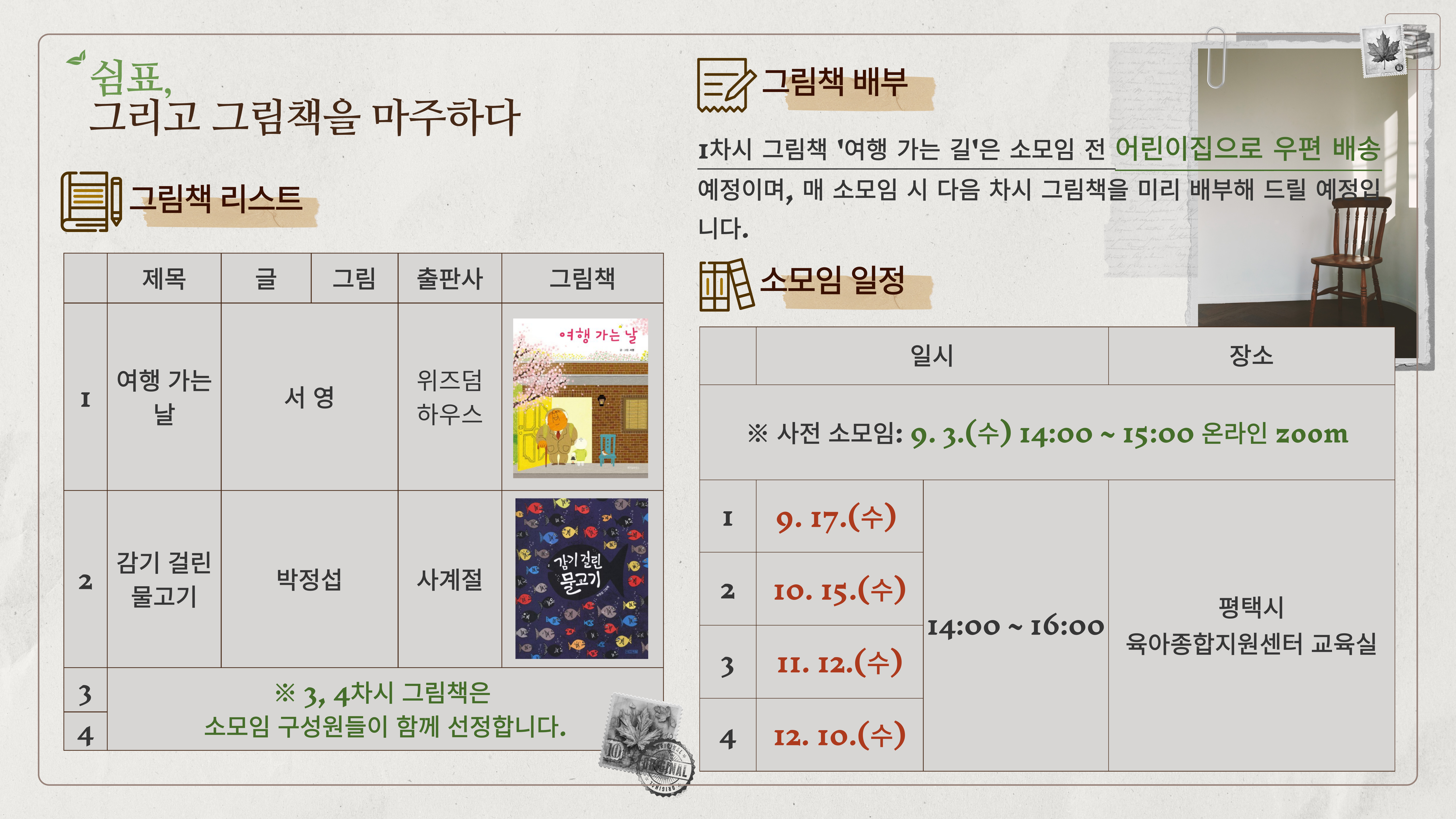 교육명 [특색사업] 쉼표, 그리고 그림책을 마주하다(8기) 교육형태 오프라인 소규모