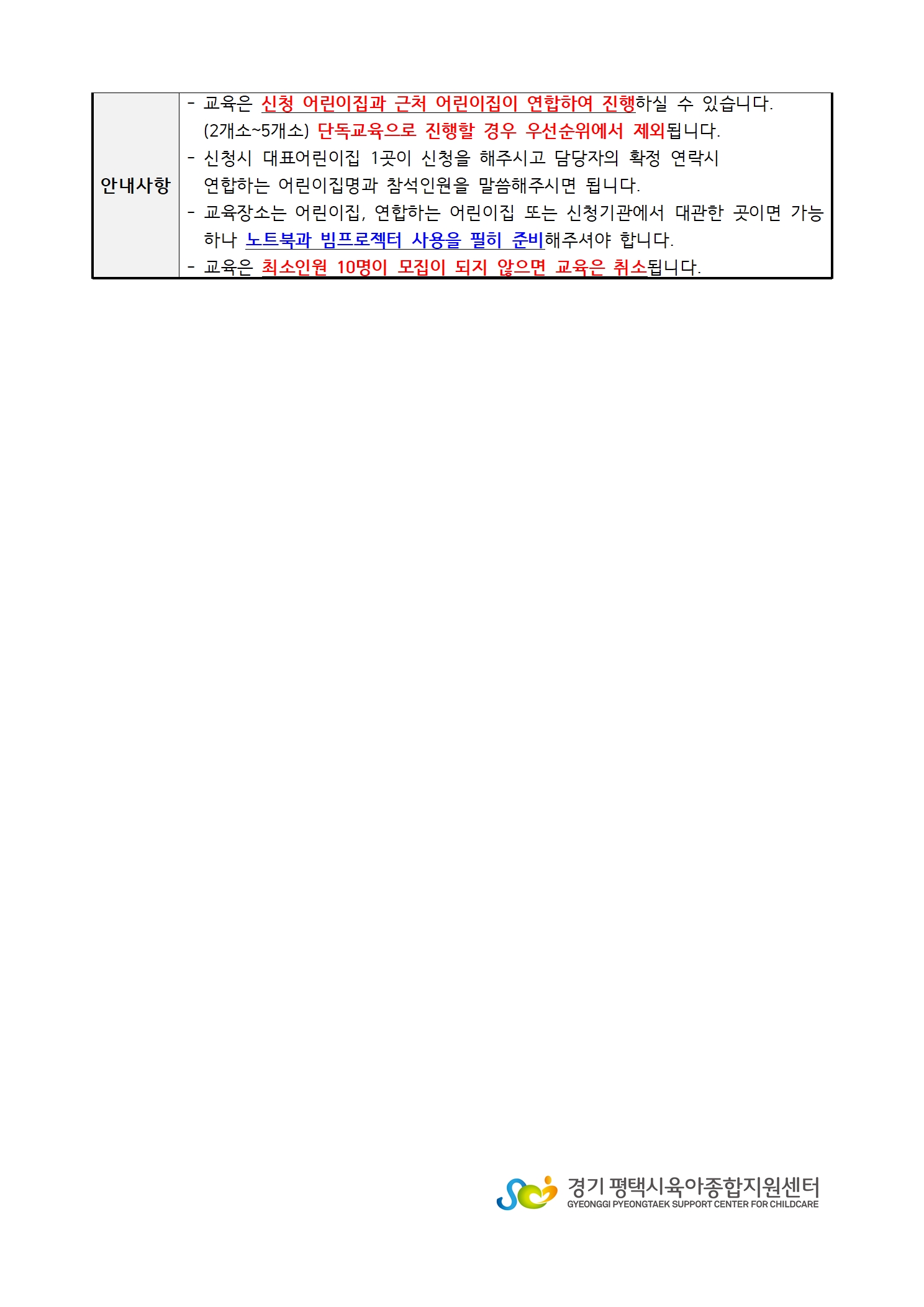 기타사항 - 진행되는 교육은 근처 어린이집과 연합하여 진행하실 수 있습니다.
