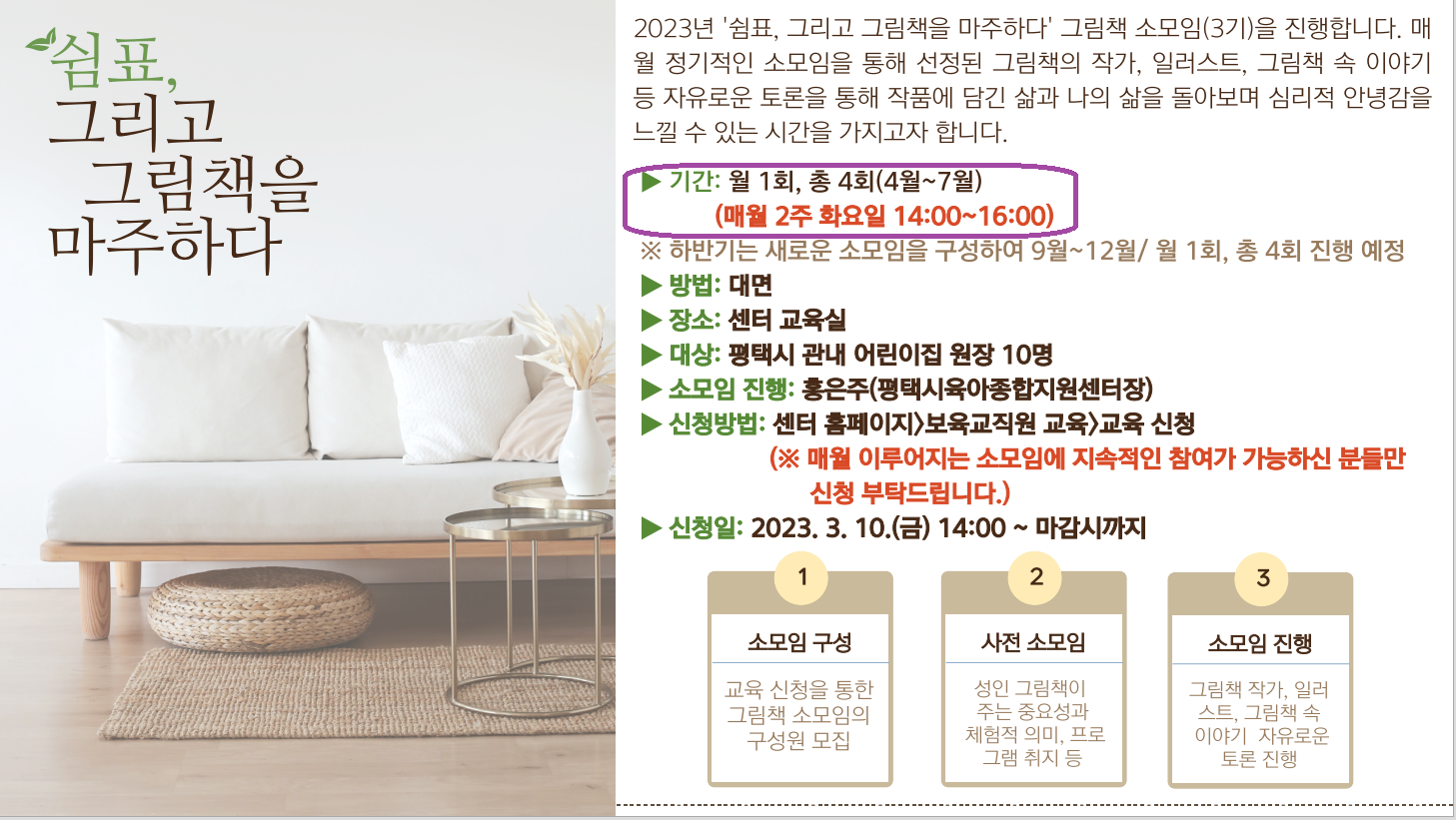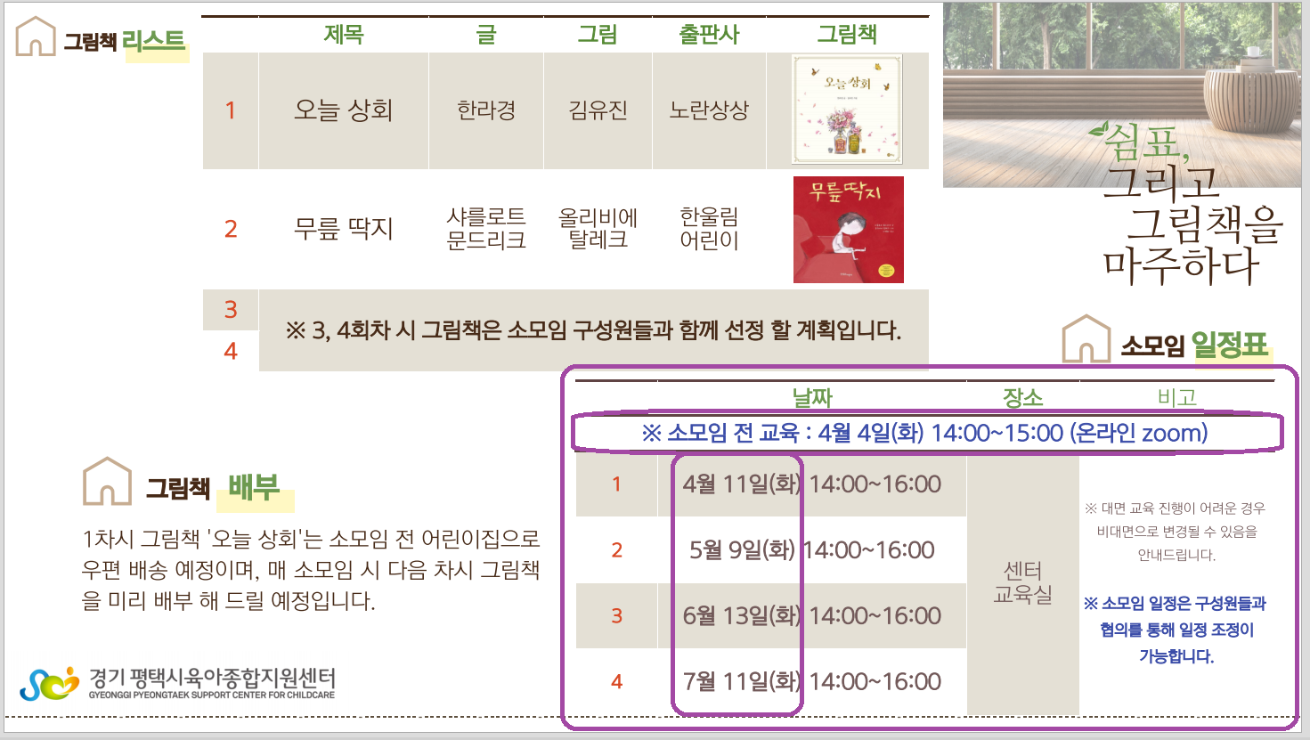 ※ 센터의 교육별 일정 조정으로 인해 그림책 소모임 일정이 매월 둘째주 화요일로 변경되었습니다.
