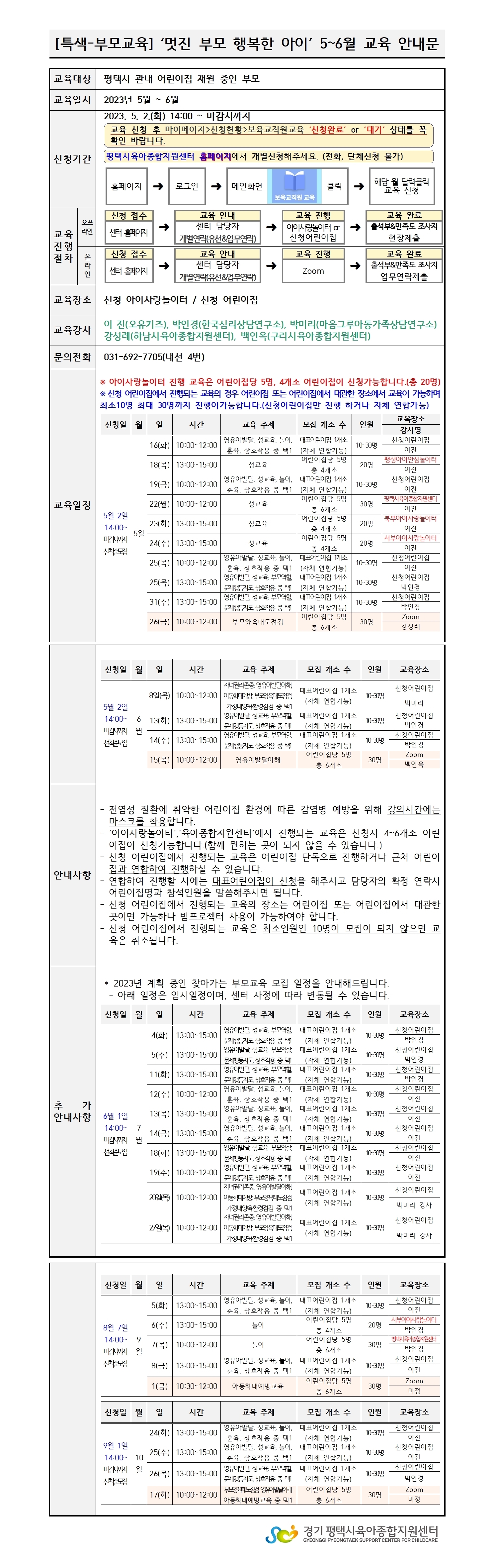 - 신청 어린이집에서 진행되는 교육은 최소인원인 10명이 모집이 되지 않으면 교육은 취소됩니다.