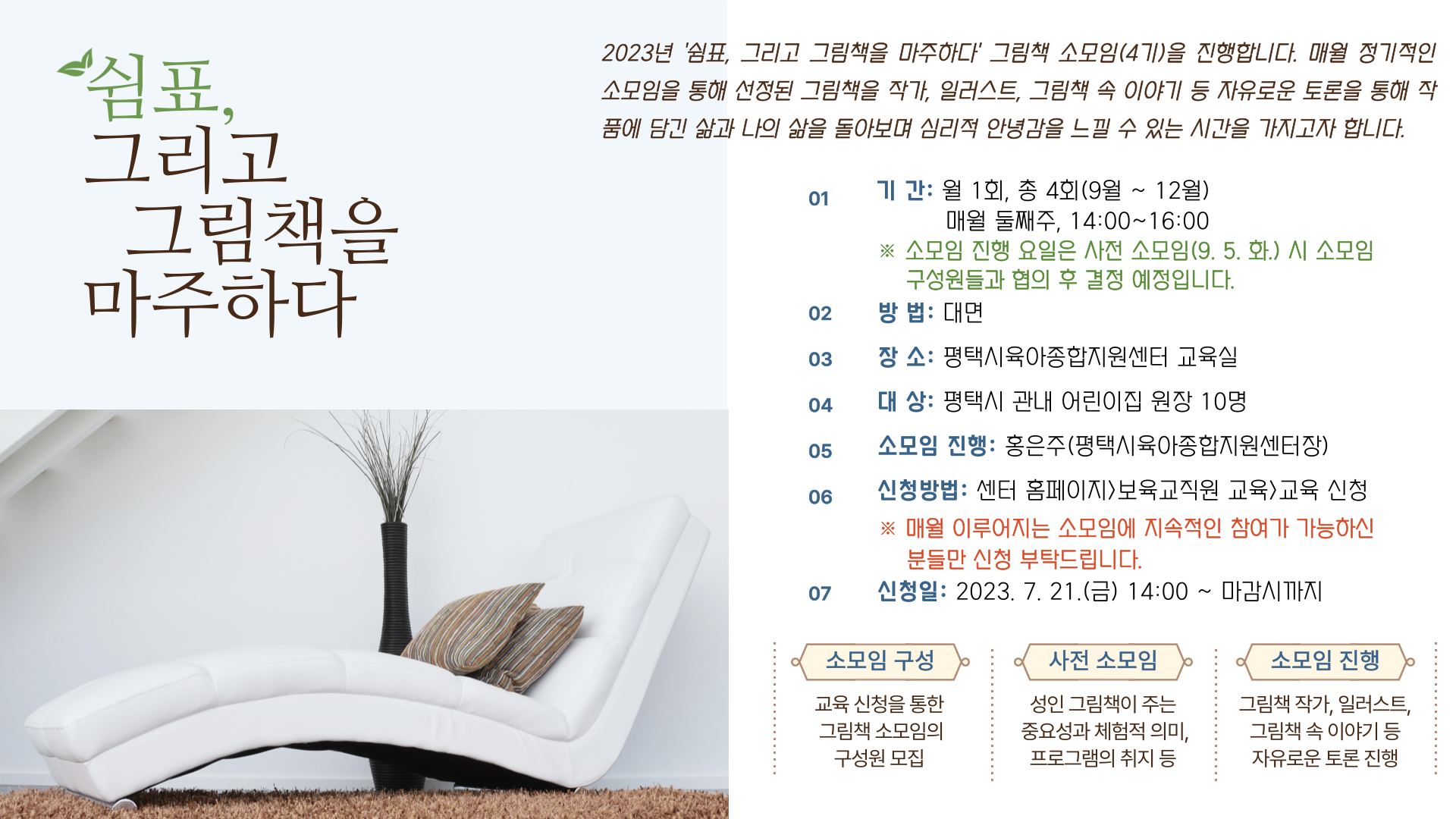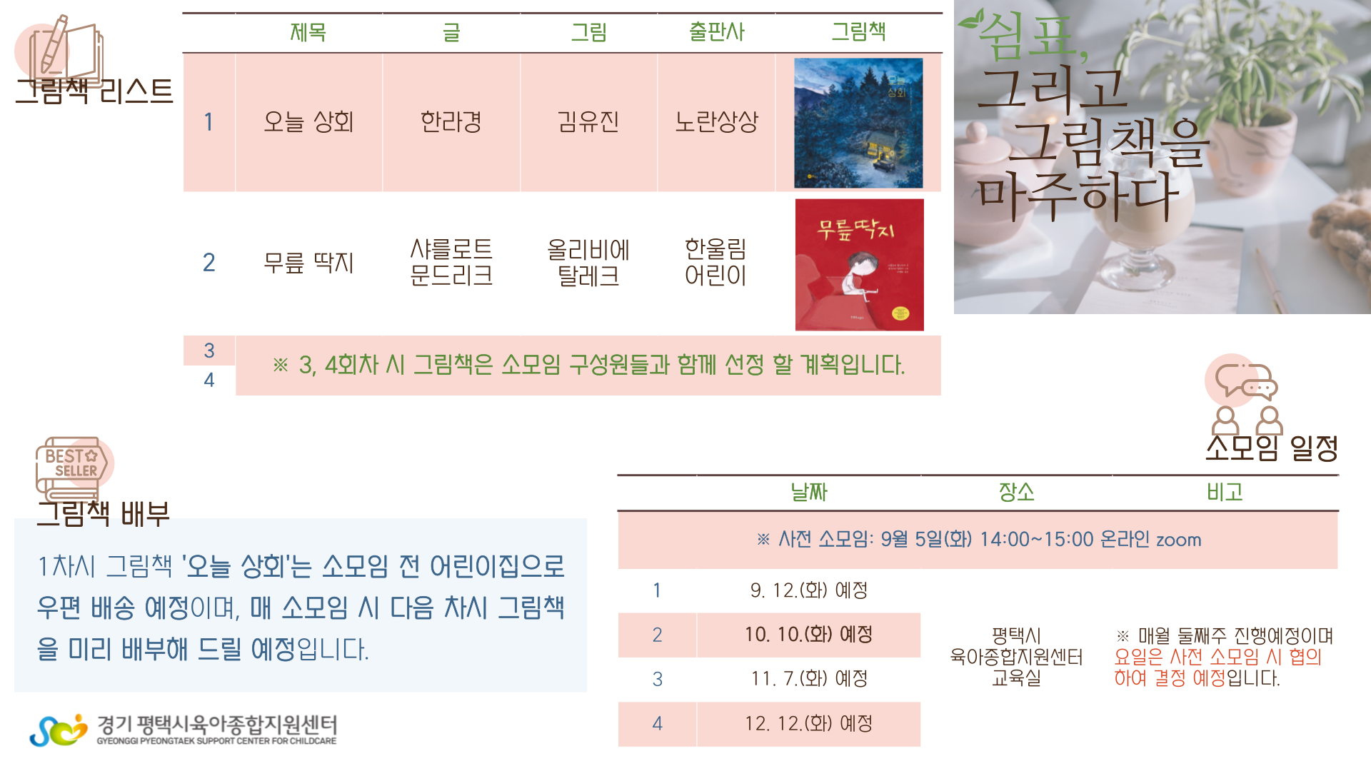 ※ 그림책 소모임은 매월 둘째주 진행 예정이며 요일 9월 5일(화) 사전 소모임 시 협의하여 결정 예정입니다.