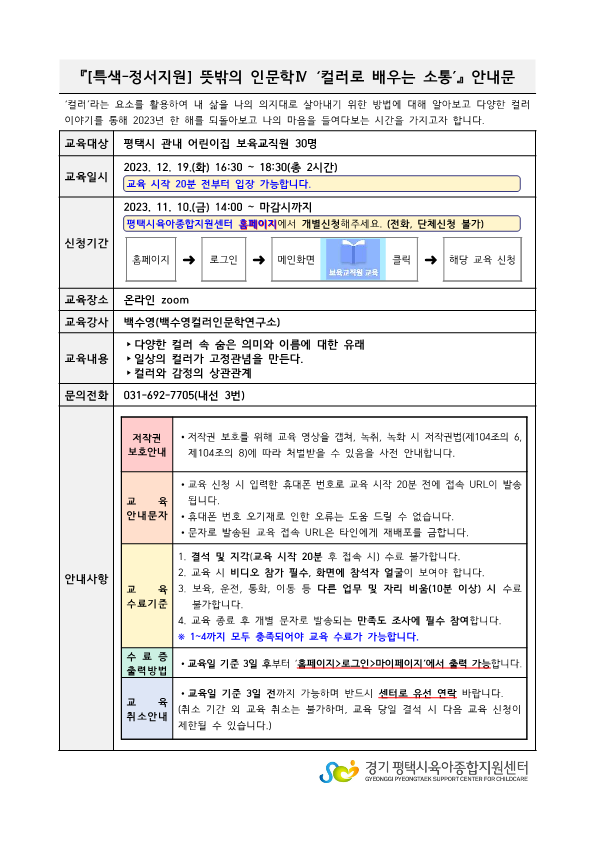 교육대상 평택시 관내 어린이집 보육교직원 강사명 백수영(백수영인문학연구소)