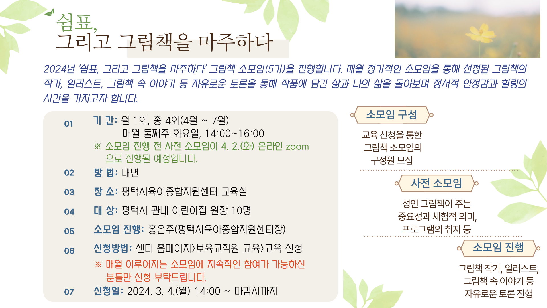 교육명 [특색사업] 쉼표, 그리고 그림책을 마주하다(5기) 교육형태 오프라인 소규모