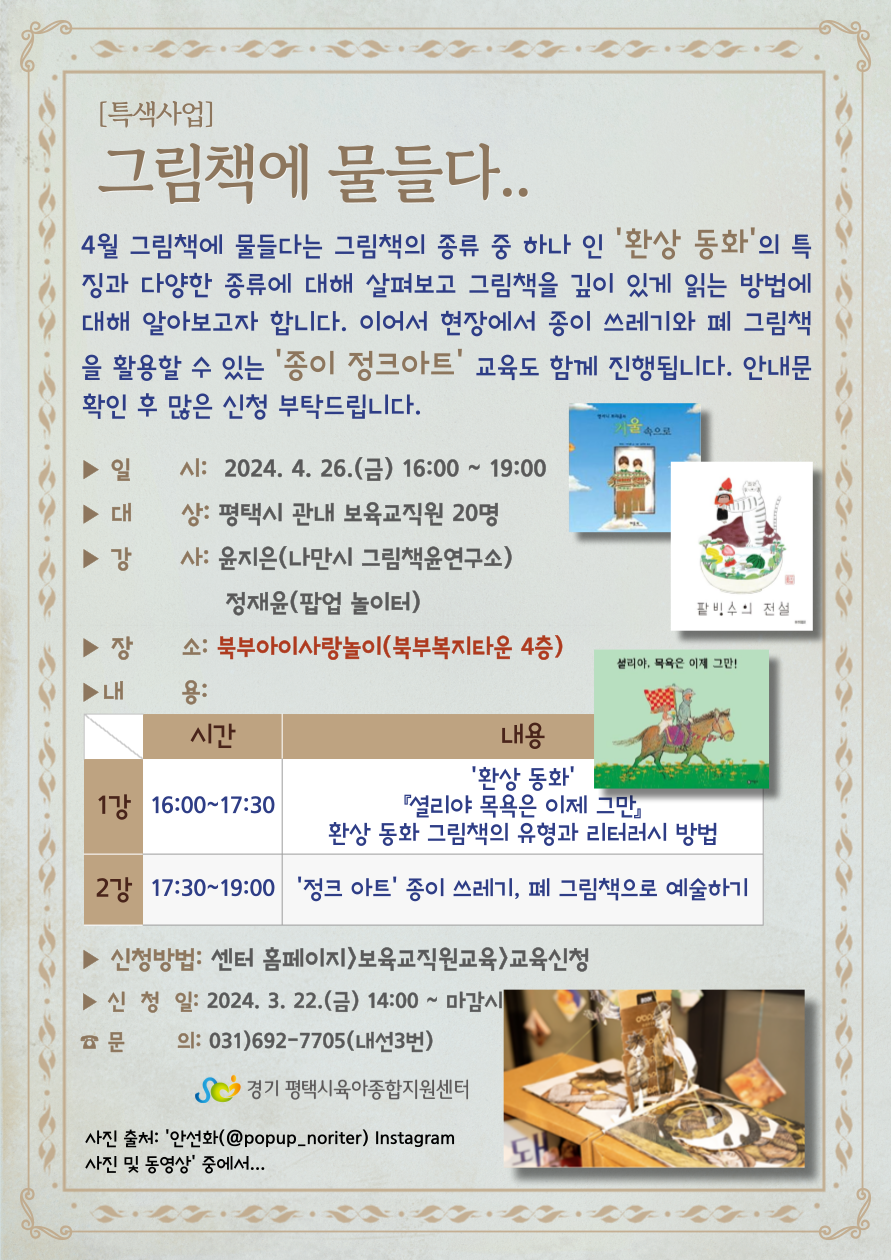 교육대상 평택시 관내 보육교직원 강사명 윤지은(나만시 그림책윤연구소), 정재윤(팝업놀이터)