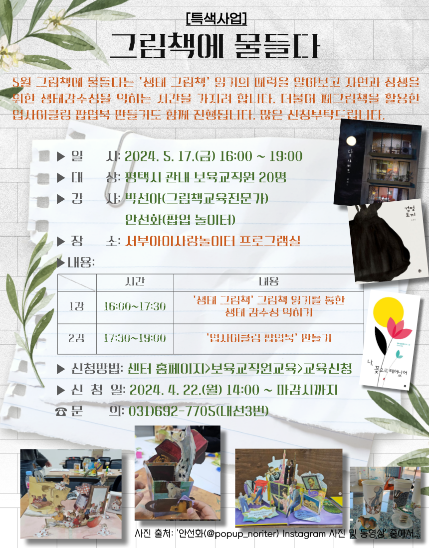 교육대상 평택시 관내 보육교직원 강사명 박선아(그림책 교육 전문가), 안선화(팝업놀이터)
