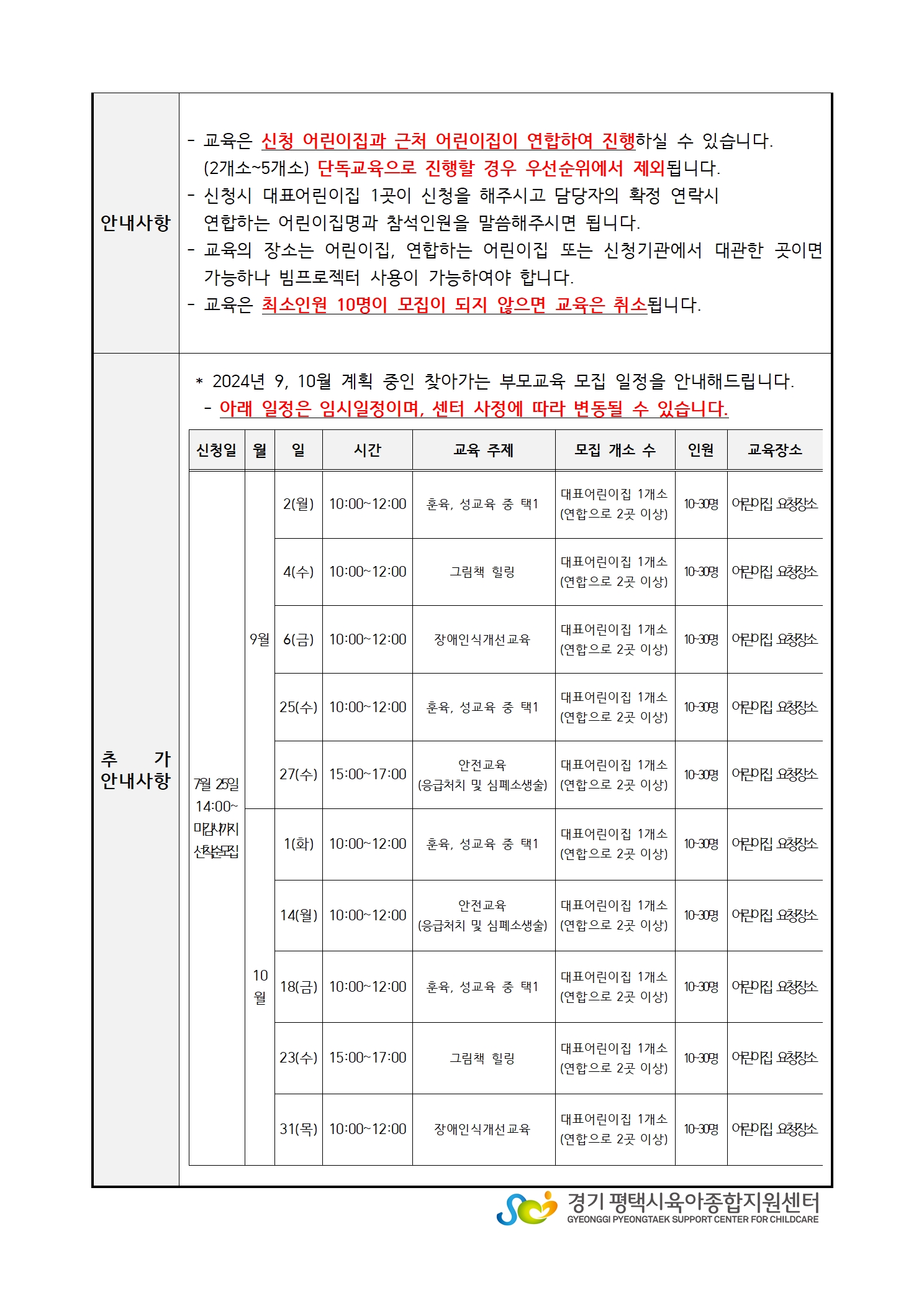 기타사항 - 진행되는 교육은 근처 어린이집과 연합하여 진행하실 수 있습니다.