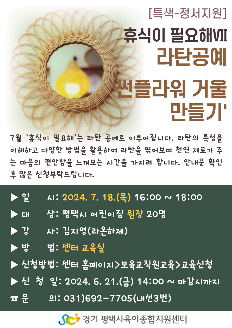 교육명 [특색사업] 휴식이 필요해 Ⅶ '라탄공예' ★원장 대상★ 교육형태 오프라인 소규모