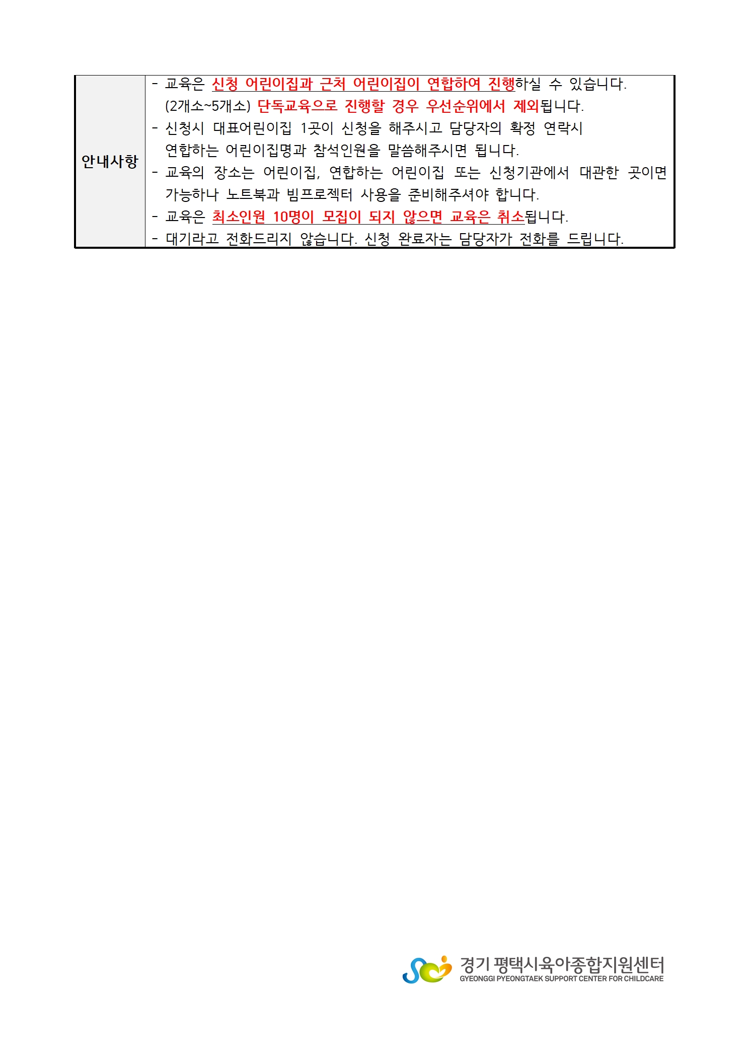 기타사항 - 진행되는 교육은 근처 어린이집과 연합하여 진행하실 수 있습니다.