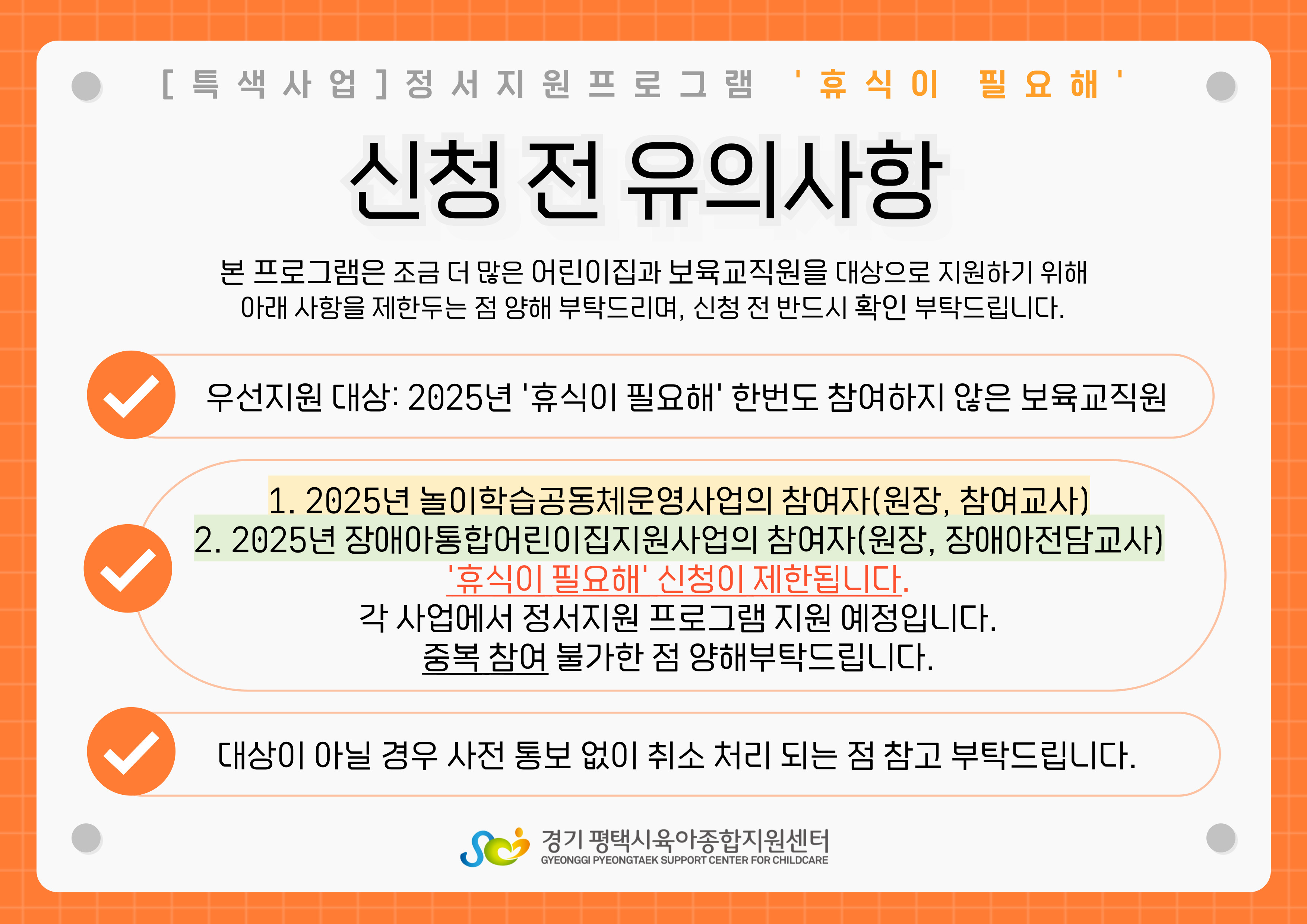 ② 2025년 놀이학습공동체운영사업과 2025년 장애아통합어린이집지원사업의 참여자는 휴식이 필요해 신청 제한