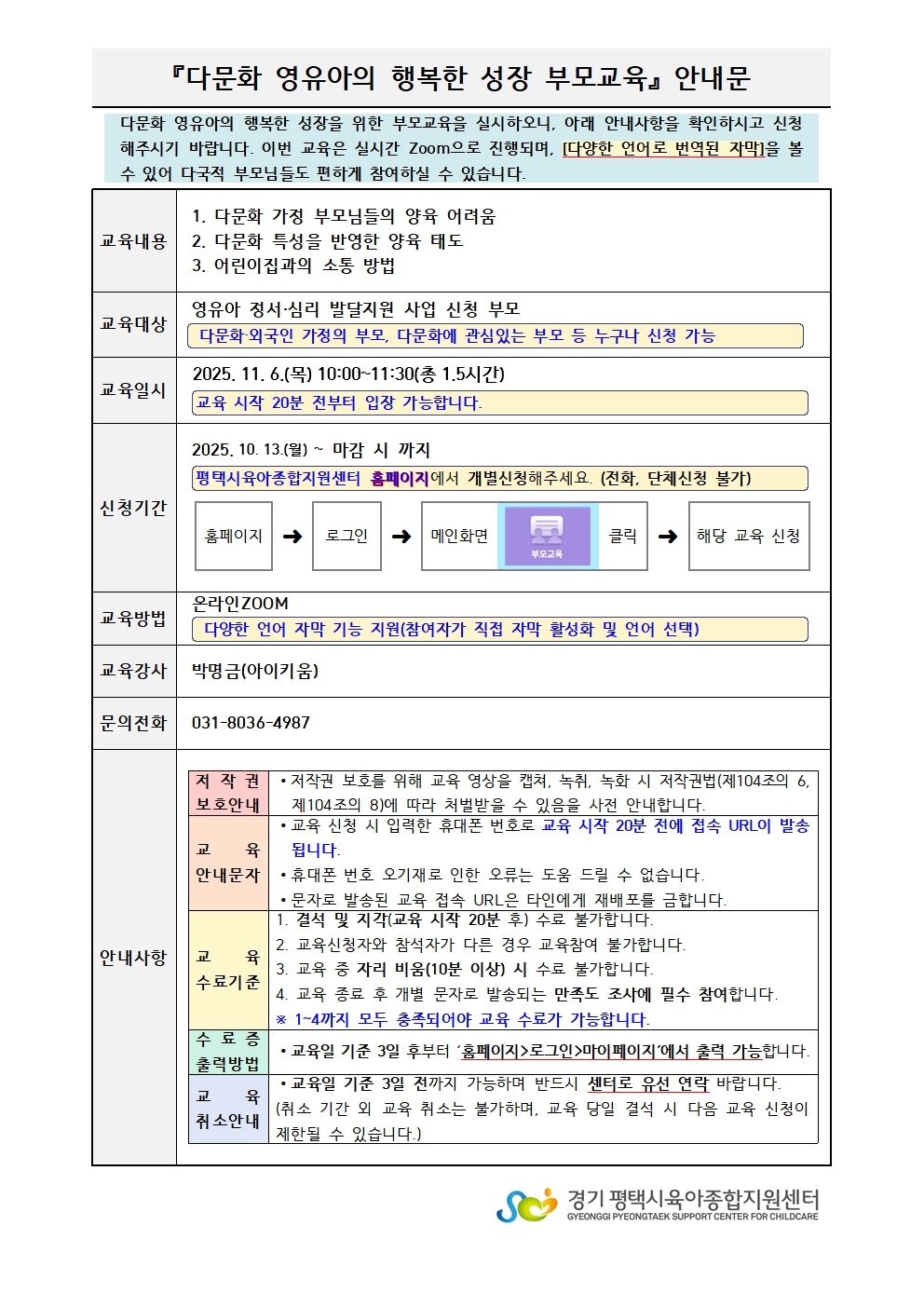 교육명 [정서·심리 발달지원] 다문화 영유아의 행복한 성장 부모교육 교육형태 온라인 zoom