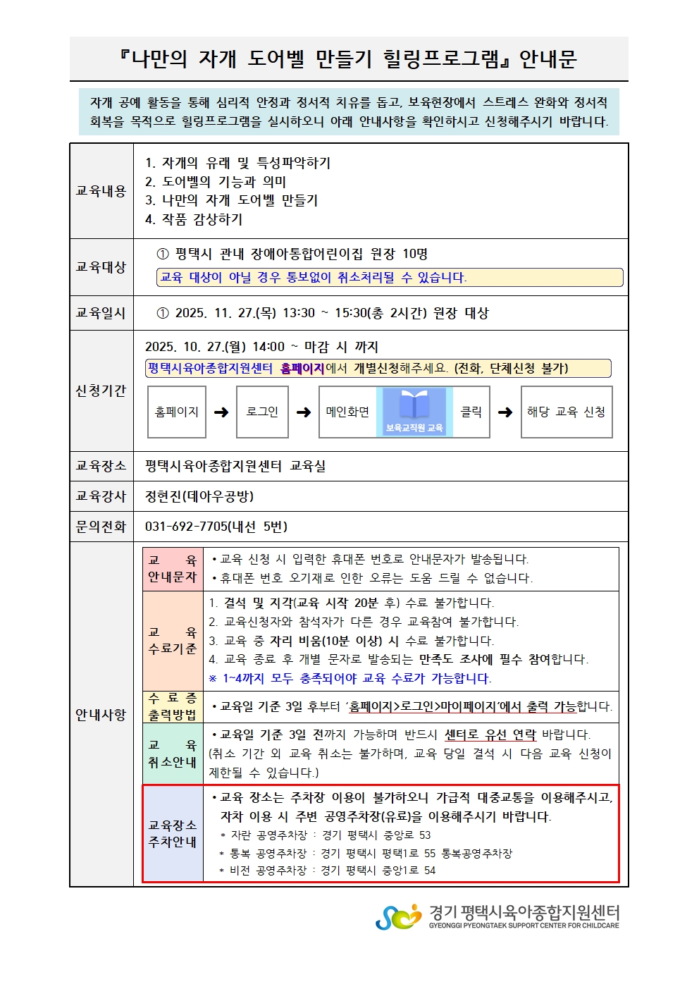 교육장소 평택시육아종합지원센터 교육실 교육비 무료
