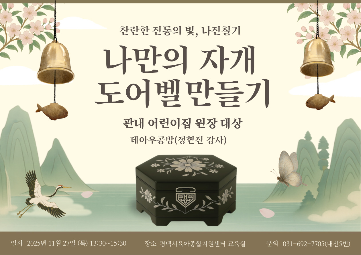교육명 [장애영유아보육교사전문성강화] 나만의 자개 도어벨 만들기 힐링프로그램 - ★관내 어린이집 원장대상★ 교육형태 오프라인 소규모