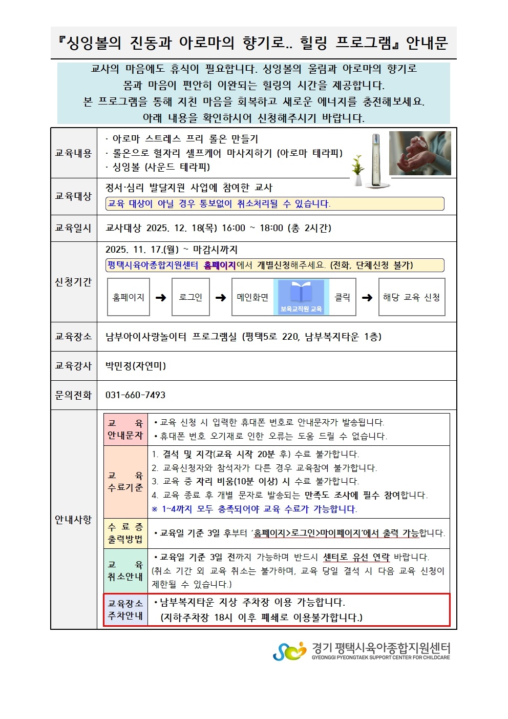 교육명 [정서·심리] (교사대상) 싱잉볼의 진동과 아로마의 향기로 힐링프로그램 교육형태 오프라인 소규모