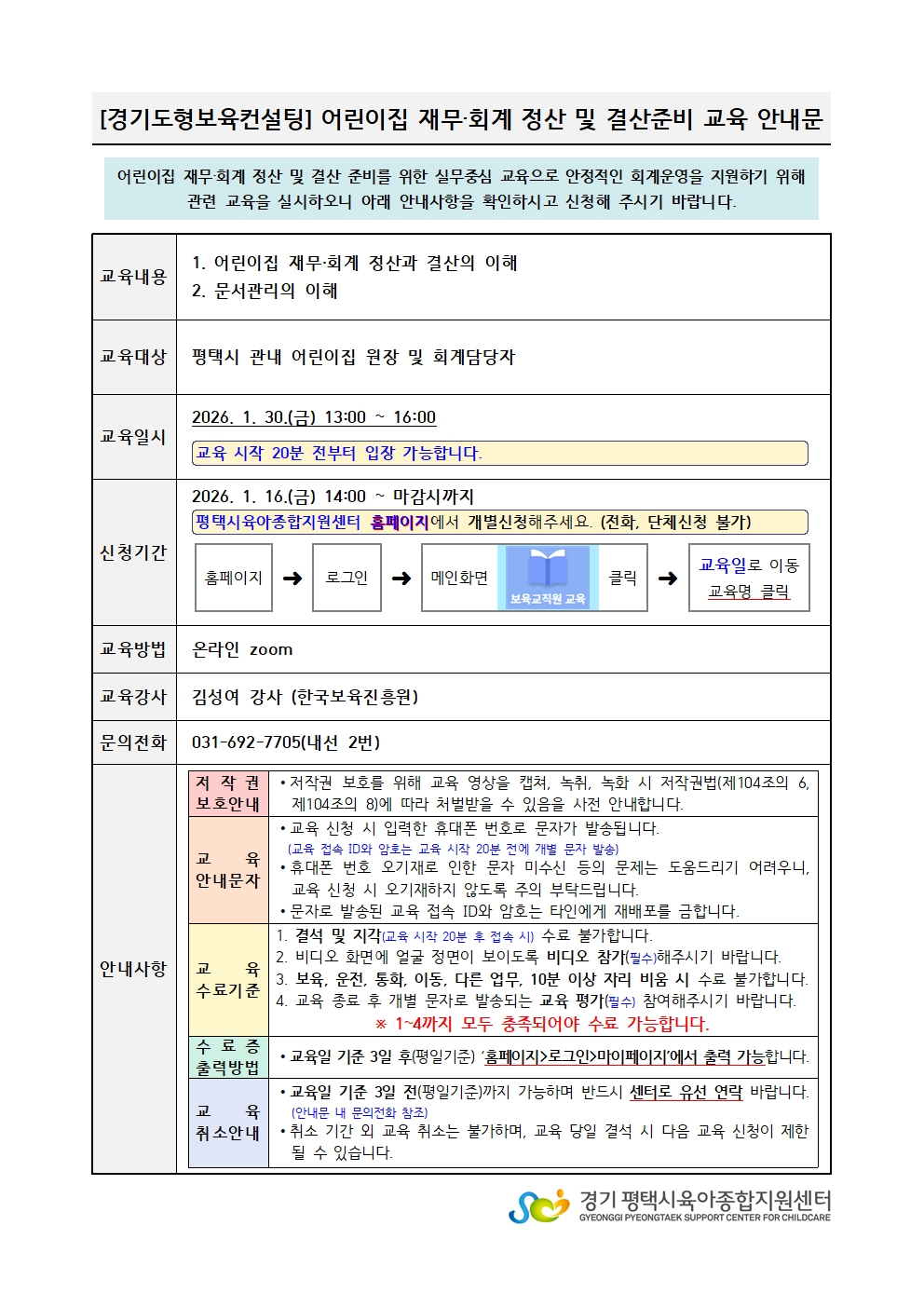 교육명 [경기도형] 어린이집 재무회계 정산 및 결산준비 교육 교육형태 온라인 zoom
