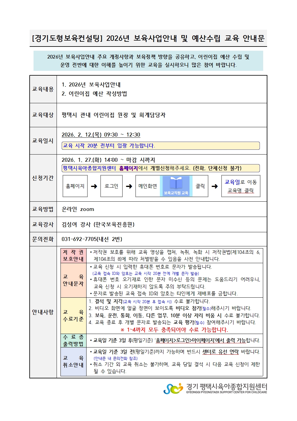 교육명 [경기도형] 2026년 보육사업안내 및 예산수립 교육 교육형태 온라인 zoom