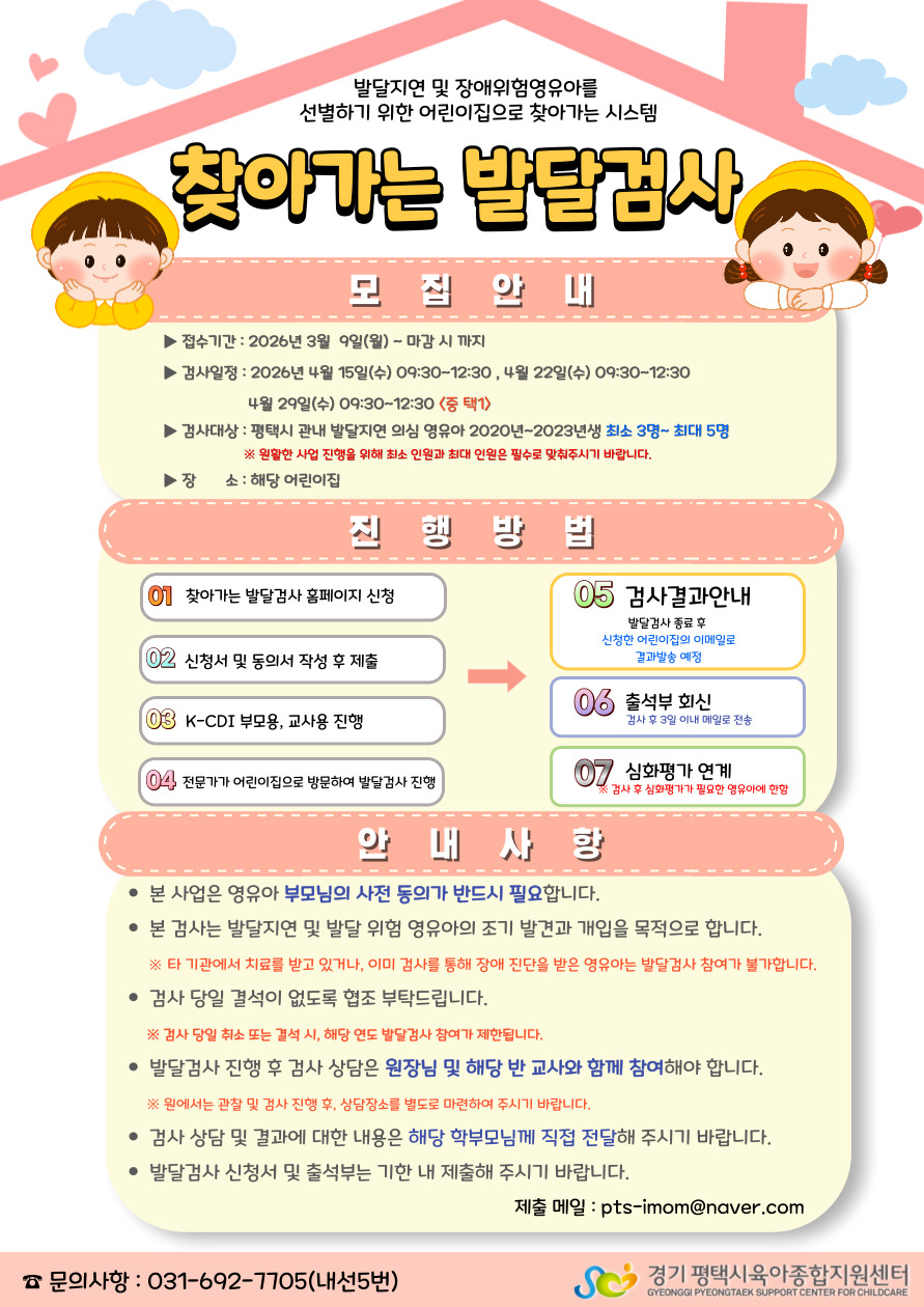 ③ 검사 당일 대상 영유아의 결석·지각이 발생하지 않도록 어린이집의 적극적인 협조를 부탁드립니다.