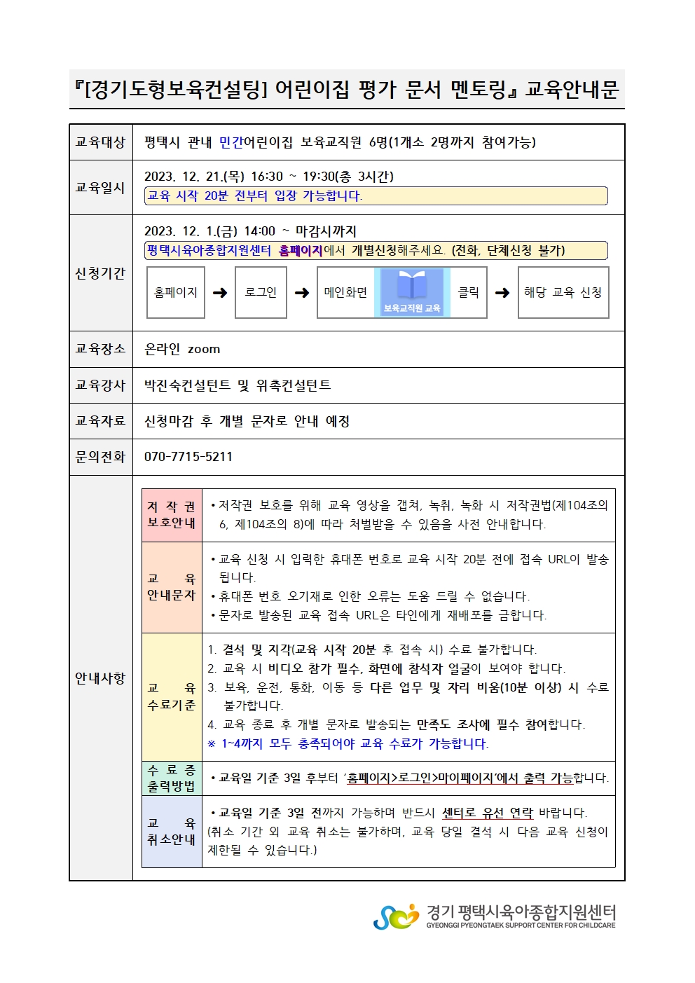 교육명 [경기도형보육컨설팅] 어린이집 평가 문서 멘토링 - 민간어린이집 대상 교육형태 온라인 zoom