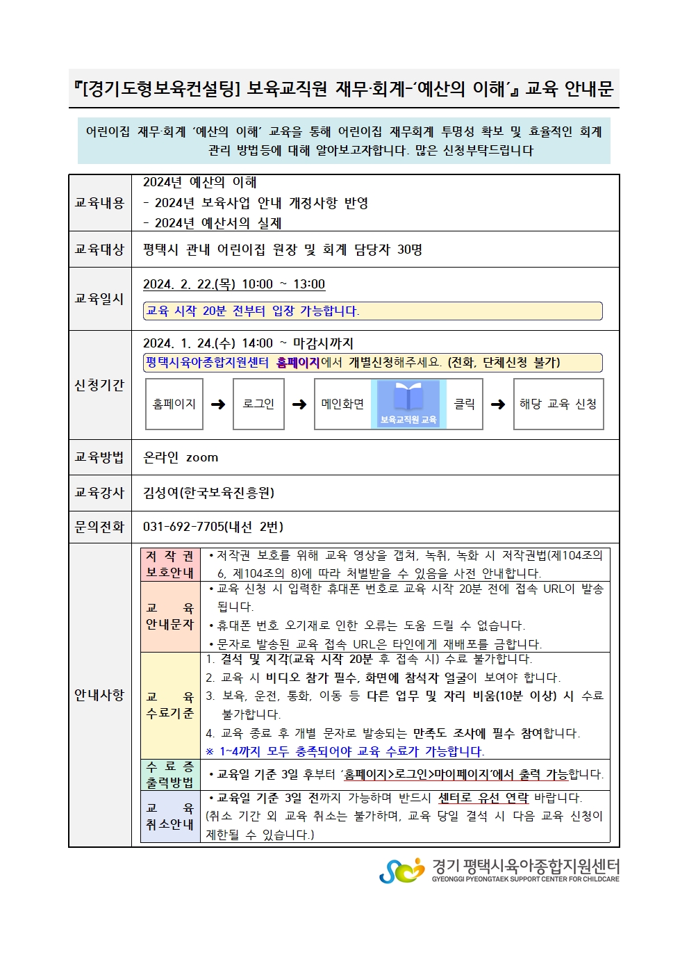 교육명 [경기도형보육컨설팅] 재무회계 교육 2024년 예산 교육형태 온라인 zoom