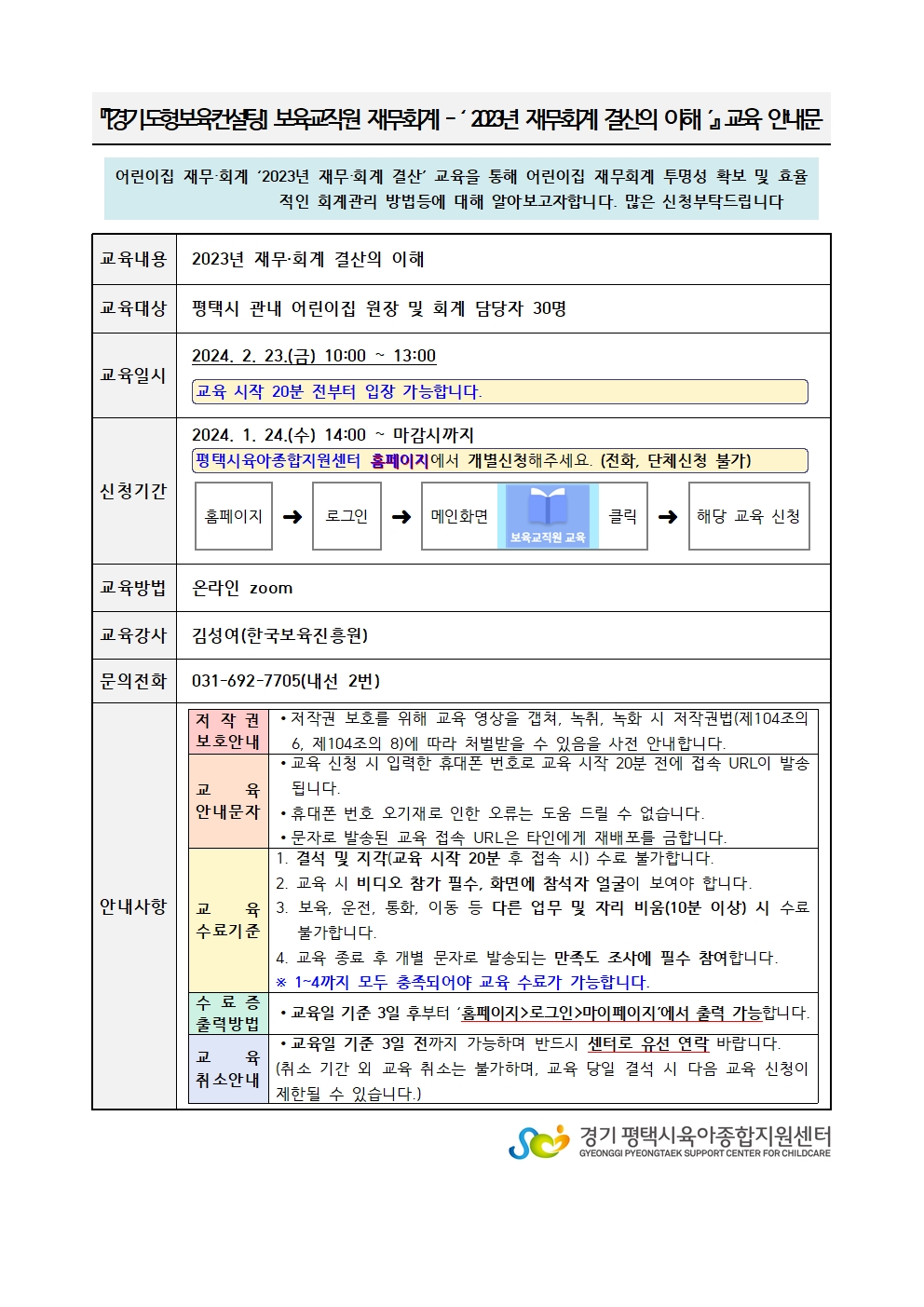 교육명 [경기도형보육컨설팅] 재무회계 교육 2023 재무회계 결산 교육형태 온라인 zoom