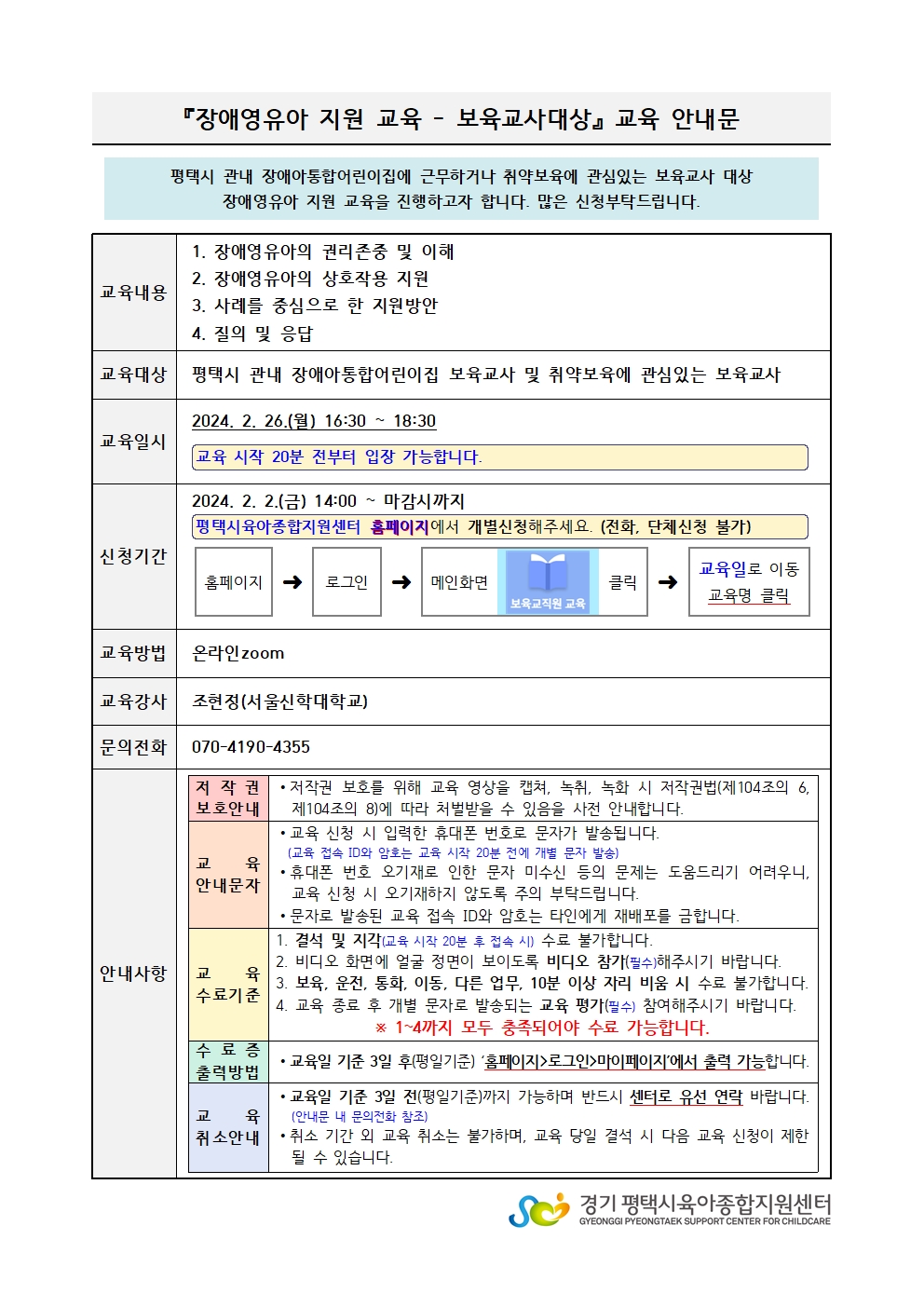교육명 [취약보육] 장애영유아 지원 교육-보육교사대상 교육형태 온라인 zoom