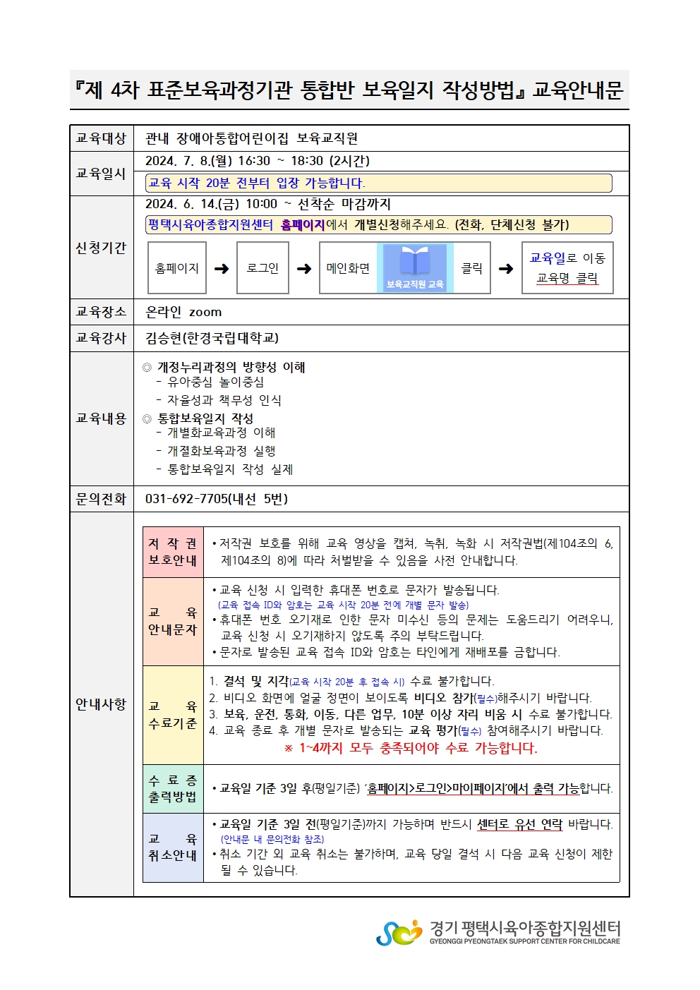 교육명 [장애영유아보육교사 전문성 강화] 제 4차표준보육과정기관 통합반 보육일지 작성방법 - 보육교직원 교육형태 온라인 zoom