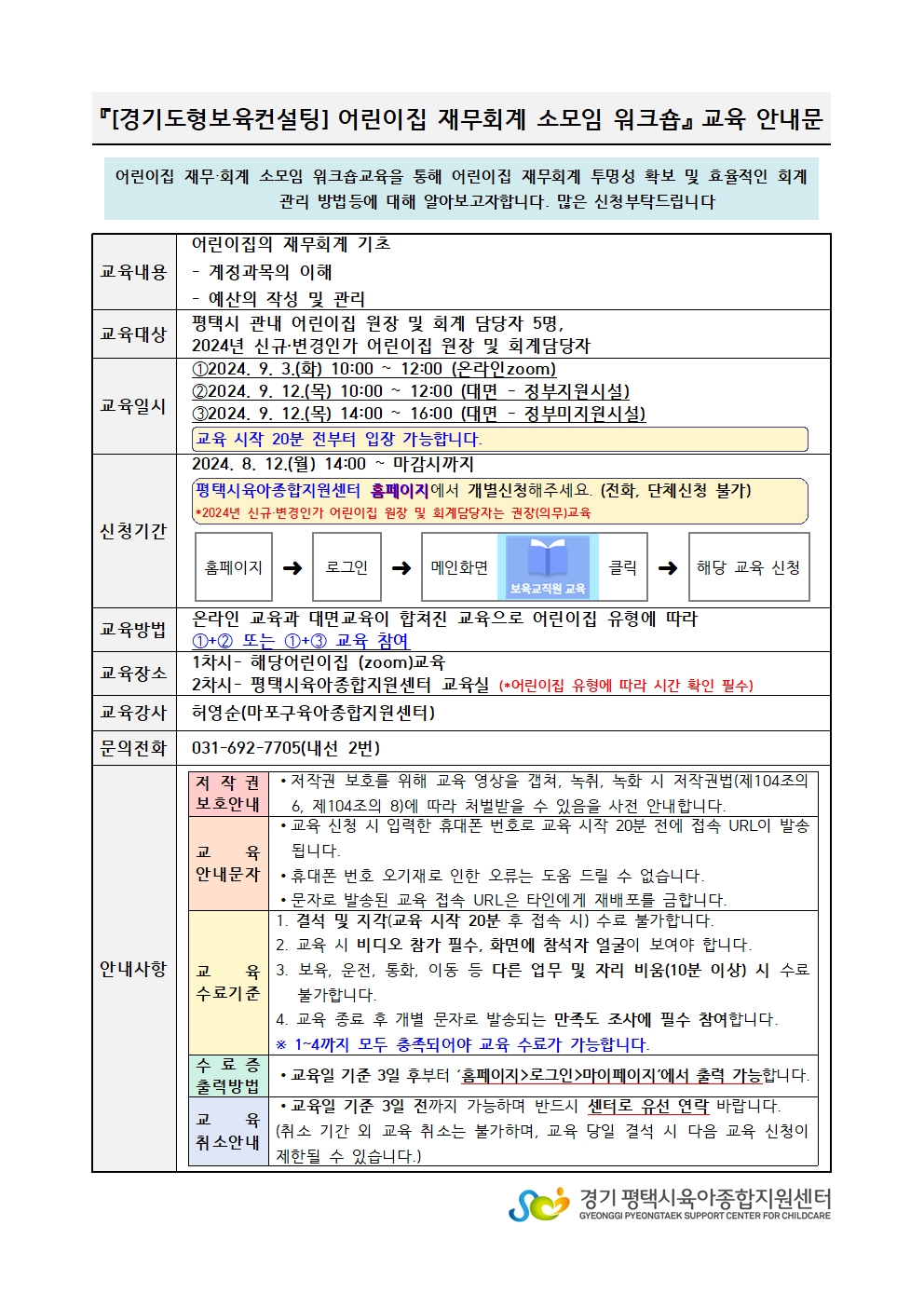 교육명 [경기도형보육컨설팅] 재무회계 소모임 워크숍 (정부지원시설) 교육형태 오프라인 소규모
