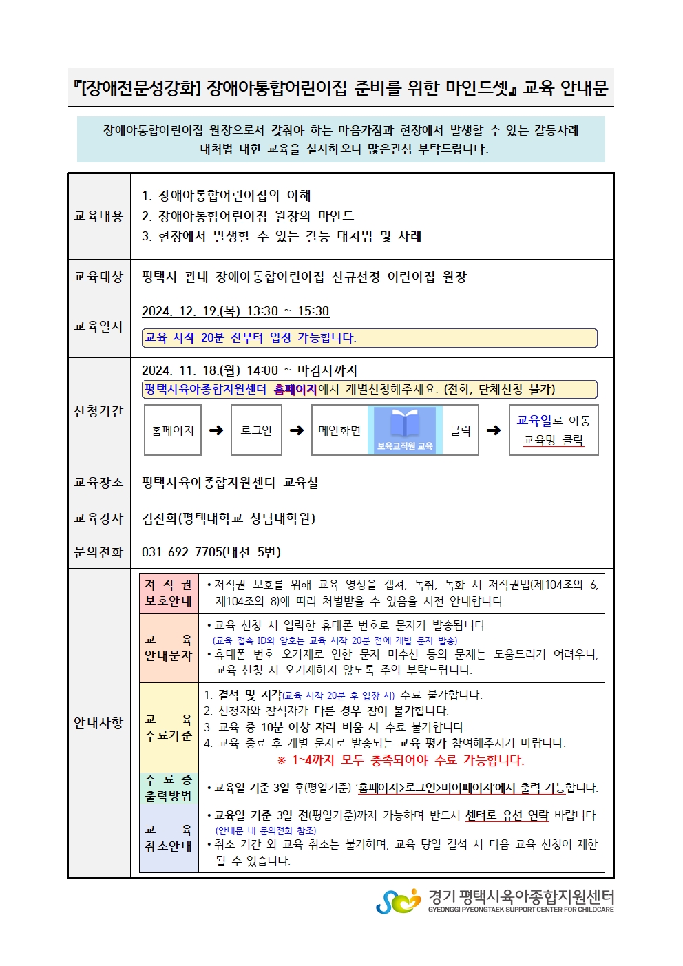 교육대상 평택시 관내 장애아통합어린이집 신규선정 어린이집 원장 강사명 김진희(평택대학교 상담대학원)