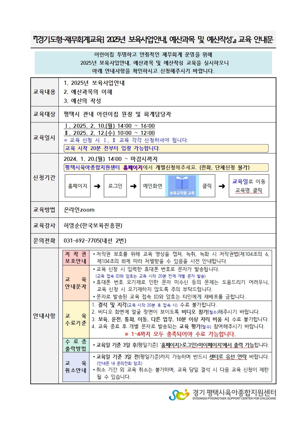 교육명 [경기도형] 재무회계 교육 2025년 보육사업 안내, 예산과목 이해 및 예산 작성 Ⅱ 교육형태 온라인 zoom