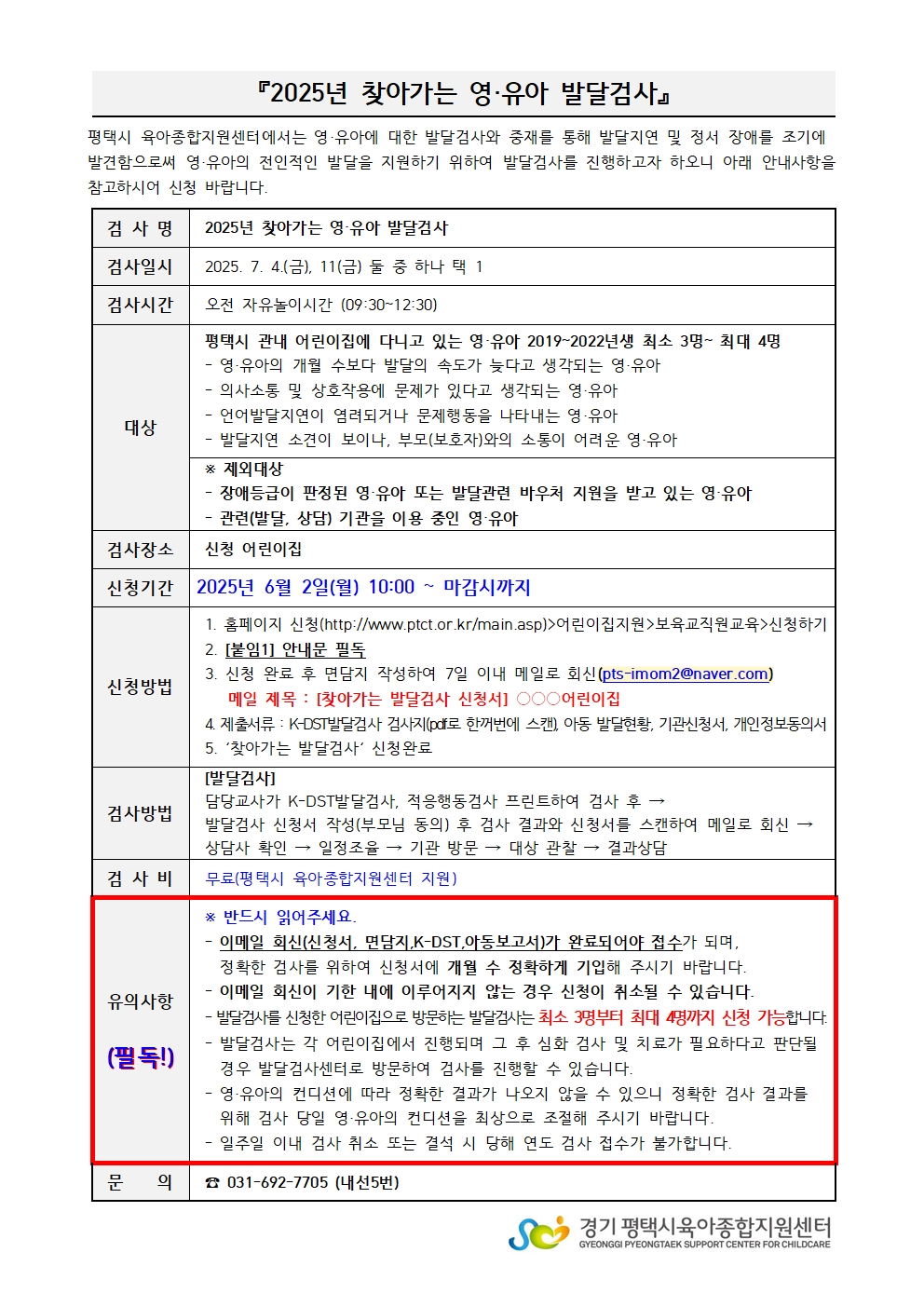 ☞ 검사시간 09시 30분 ~ 12시 30분(3H)이며, 검사대상 영유아 결석 지각 하지 않도록 원 협조 필요.