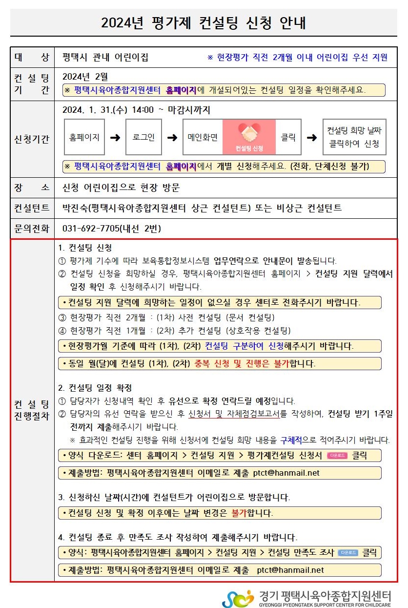 | 컨설팅 장소 | 해당어린이집 | 컨설턴트 명 | 박진숙(평택시육아종합지원센터) 또는 비상근컨설턴트 |