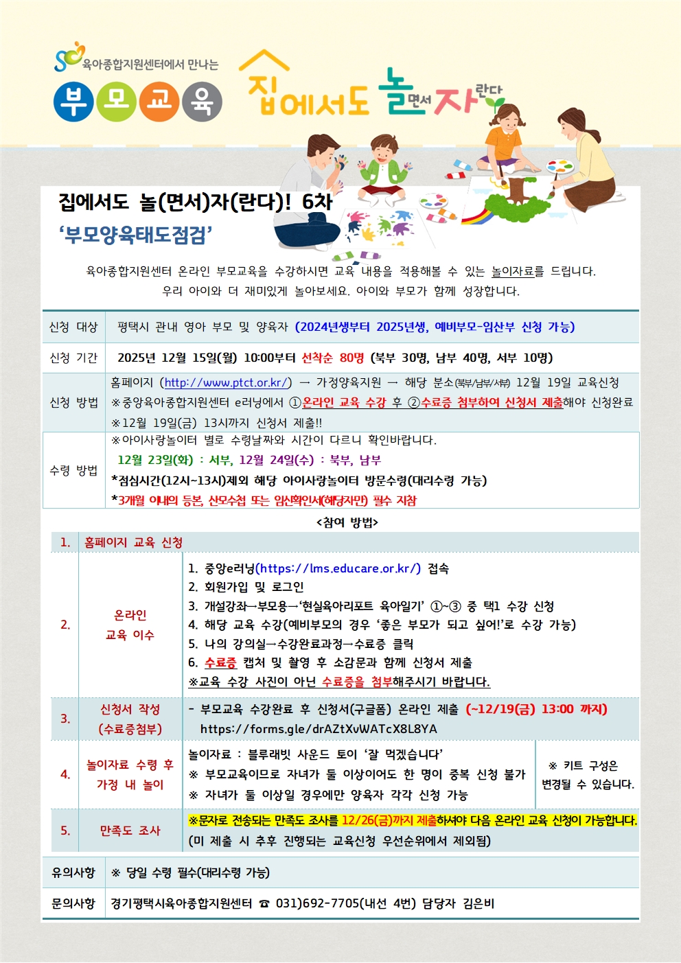 * 신청완료 후 확정문자를 보내드리지 않습니다. 접수가 완료되면 링크를 통해 신청서 보내주시면 됩니다. **신청서 링크 : https://forms.gle/drAZtXvWATcX8L8YA ***12/19(금)까지 신청서 접수!! ***12/24(수) 놀이꾸러미 배부!! ***예비부모는 수령시 산모수첩 or 임신확인서 지참 홈페이지 교육 신청 후 반드시 중앙e-러닝 홈페이지에서 교육을 이수하셔야 합니다(두 가지 모두 필수). 신청서 링크를 통해 수료증을 제출해 주셔야 놀이자료를 배부 받으실 수 있습니다.