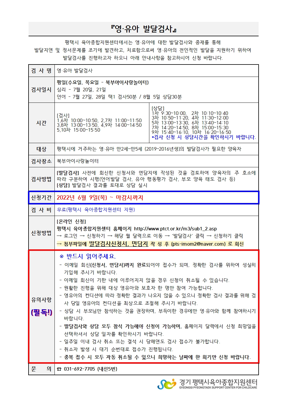 ![]() ![]() * 많은 영유아들이 참여할 수 있도록 언어, 심리 중 1개만 신청해주세요. * 영유아 [언어]발달검사 신청입니다. * - 아래의 시간을 확인하시고 검사와 상담 참여가 모두 가능하신 경우만 신청해주세요. ** 신청완료 후 첨부파일을 속 신청서 및 면담지를 작성하시어, 이메일(pts-imom2@naver.com)로 회신해주셔야 검사가 확정됩니다. 신청 후 불참 시 올해 발달검사 참여가 불가합니다. ※ 자세한 사항은 첨부된 안내문을 확인해주시기 바랍니다. 검사, 상담 내용(언어, 심리)에 따라 스케줄이 변동될 수 있습니다.