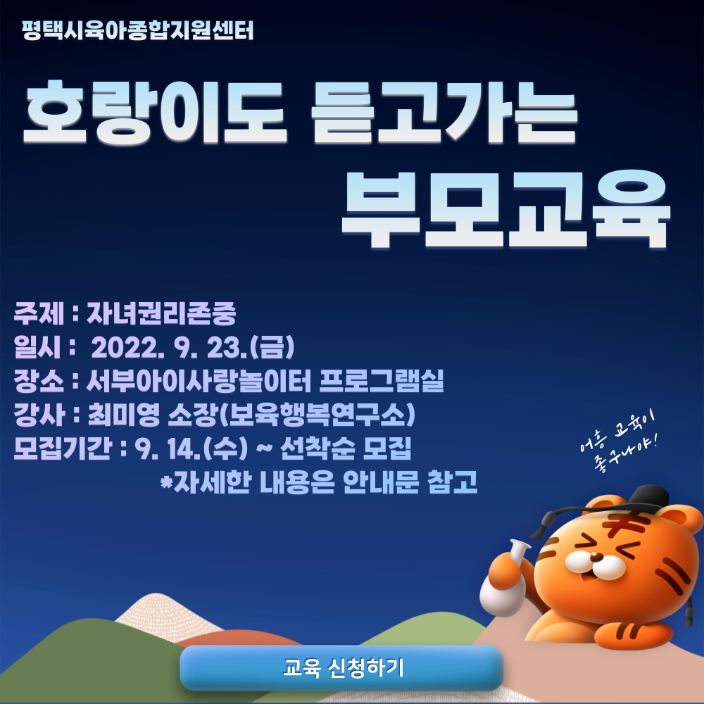 * * 반드시 읽어주세요 * * ※ 평택시 관내 영유아 가정양육을 지원하는 교육으로, 수료증 발급은 되지 않습니다. ※ 교재가 배부되는 교육이므로 신청 후 꼭 참석해주시기 바랍니다. ※ 오전 오후로 진행되는 교육으로 간단한 간식이 제공됩니다. ※ 신청 취소 시 다음 교육 및 프로그램 참여에 제한이 있을 수 있습니다.