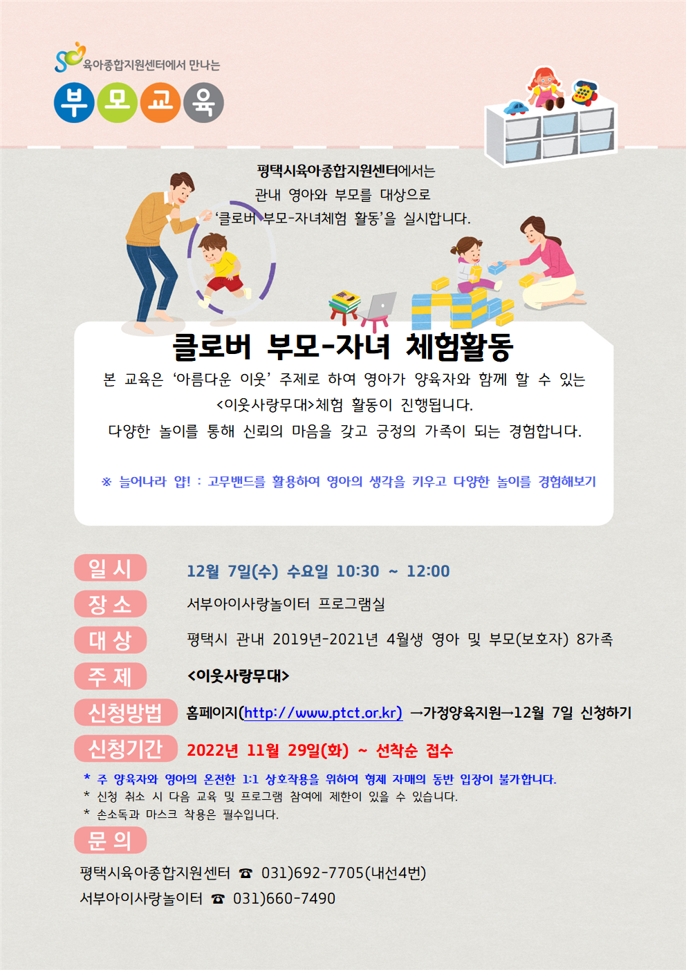 ☎문의: 평택시육아종합지원센터 서부 부모교육 담당자(031-660-7490)