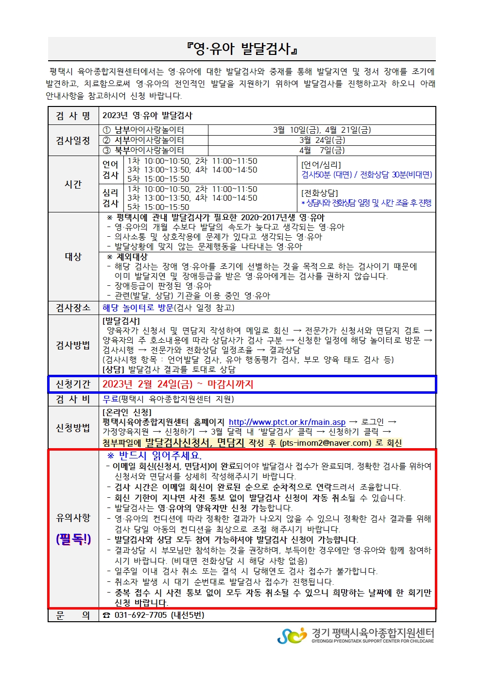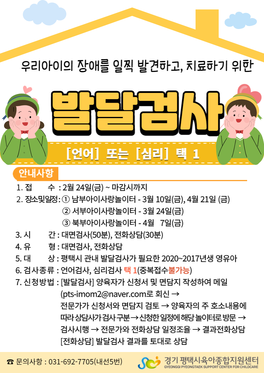 | 1차 심리검사 신청 페이지입니다. 많은 영유아들이 참여할 수 있도록 언어, 심리 중 1개만 신청해주세요. ** 신청완료 후 첨부파일을 속 신청서 및 면담지를 작성하시어, 이메일(pts-imom2@naver.com)로 회신해주셔야 검사가 확정됩니다. 신청 후 불참 시 올해 발달검사 참여가 불가합니다. ※ 자세한 사항은 첨부된 안내문을 확인해주시기 바랍니다.