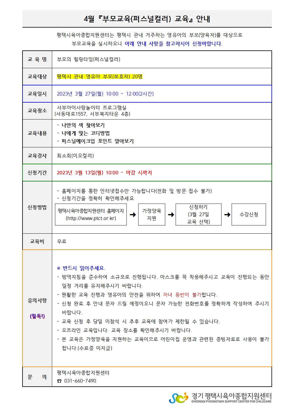 * * 반드시 읽어주세요 * * ※ 평택시 관내 영유아 가정양육을 지원하는 교육으로, 수료증 발급은 되지 않습니다. ※ 신청 취소 시 다음 교육 및 프로그램 참여에 제한이 있을 수 있습니다. ※ 원활한 교육진행과 영유아의 안전을 위하여 자녀 동반이 불가합니다. ☎문의: 서부아이사랑놀이터 부모교육 담당자(031-660-7490)